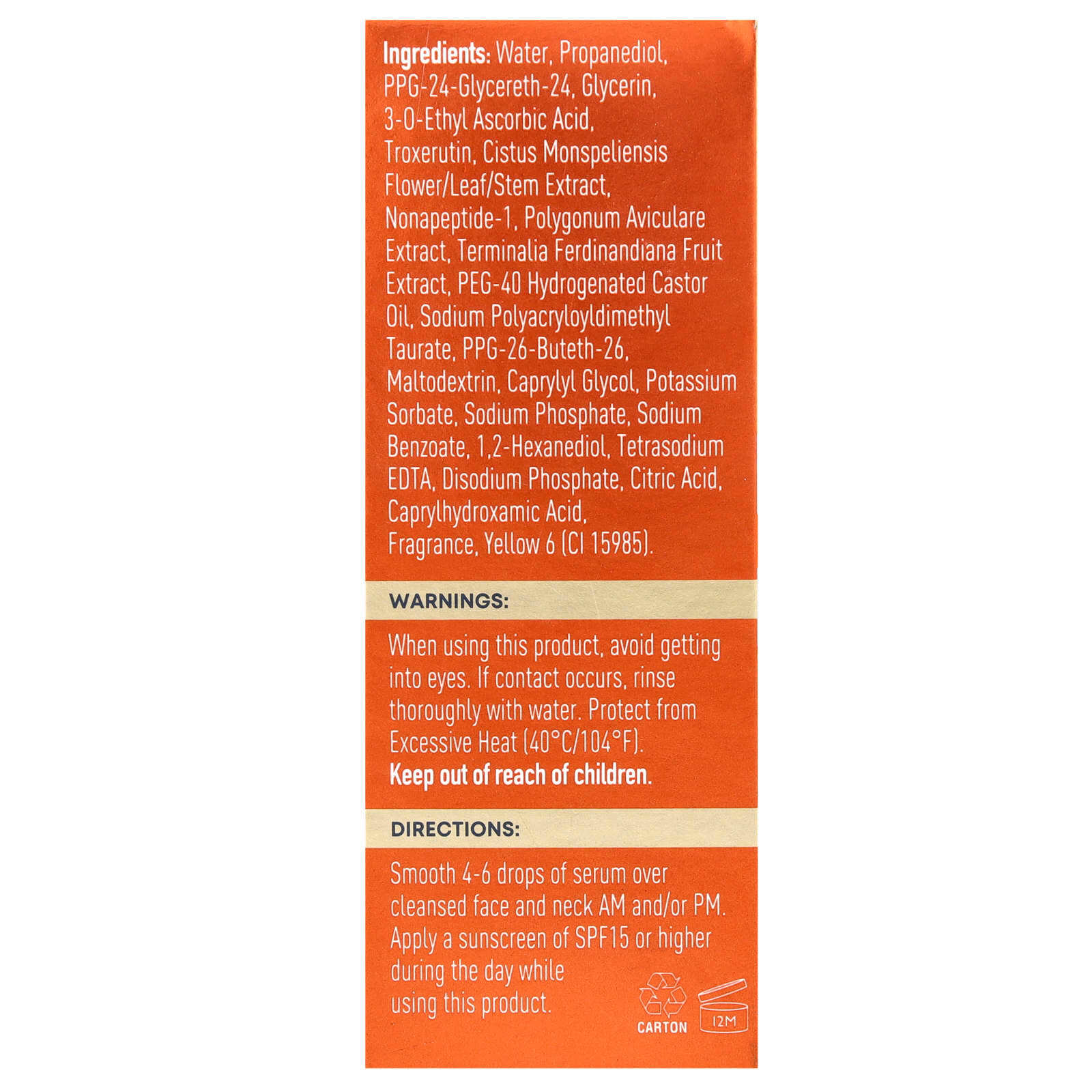Вода, пропандиол, ППГ-24-глицерет-24, глицерин, 3-о-этил-аскорбиновая кислота, троксерутин, 1,2-гександиол, полиакрилодиметил таурат натрия, ППГ-26-бутет-26, отдушка, ПЭГ-40 гидрогенизированное касторовое масло, каприлилгликоль, динатрий фосфат, нонапептид-1, фосфат натрия, каприлгидроксаминовая кислота, двунатриевая ЭДТК, экстракт горца птичьего (Polygonum aviculare), экстракт цветков/листьев/стебля ладанника (Cistus monspeliensis), мальтодекстрин, экстракт плодов сливы какаду (Terminalia ferdinandiana), лимонная кислота, краситель желтый 6 (CI 15985).