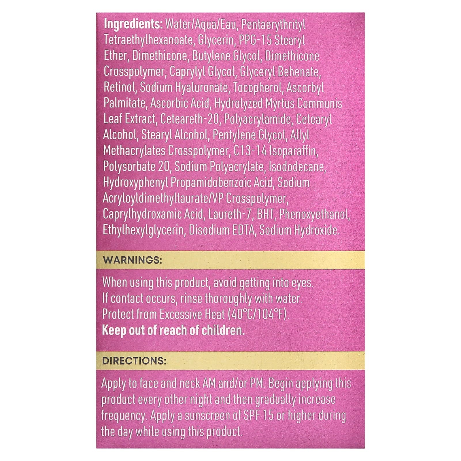 Вода, пентаэритритил тетраэтилгексаноат, глицерин, диметикон, ППГ-15 стеарил эфир, стеариловый спирт, цетеариловый спирт, бутиленгликоль, глицерил бегенат, цетеарет-20, изогексадекан, диметикон кроссполимер, циклопентасилоксан, полиэтилен, полиакрилат натрия, феноксиэтанол, каприлилгликоль, натрия акрилоилдиметилтаурат/ВП кроссполимер, полиакриламид, ПТФЭ, c13-14 изопарафин, хлорфенезин, полисорбат 20, гидролизованный экстракт листьев мирта обыкновенного (Myrtus communis), ретинол, ионол, гиалуронат натрия, двунатриевая ЭДТК, гидроксид натрия, Laurenth-7, аскорбиновая кислота, пентилен гликоль, гидроксифенилпропамидобензойная кислота.