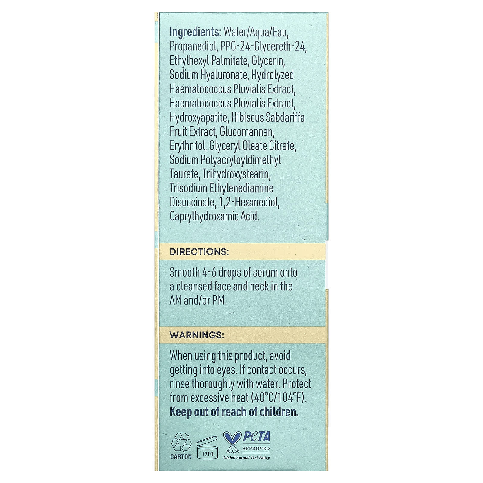 Вода (eau), пропандиол, ППГ-24-глицерет-24, этилгексил пальмитат, глицерин, гиалуронат натрия, гидролизованный экстракт гематококка (Haematococcus pluvialis), экстракт гематококка дождевого (Haematococcus pluvialis), гидроксиапатит, экстракт плодов розеллы (Hibiscus sabdariffa), глюкоманнан, эритритол, глицерил олеат цитрат, полиакрилодиметил таурат натрия, тригидроксистеарин, тринатрия этилендиамина диукцинат, 1,2-гександиол, каприлгидроксаминовая кислота.