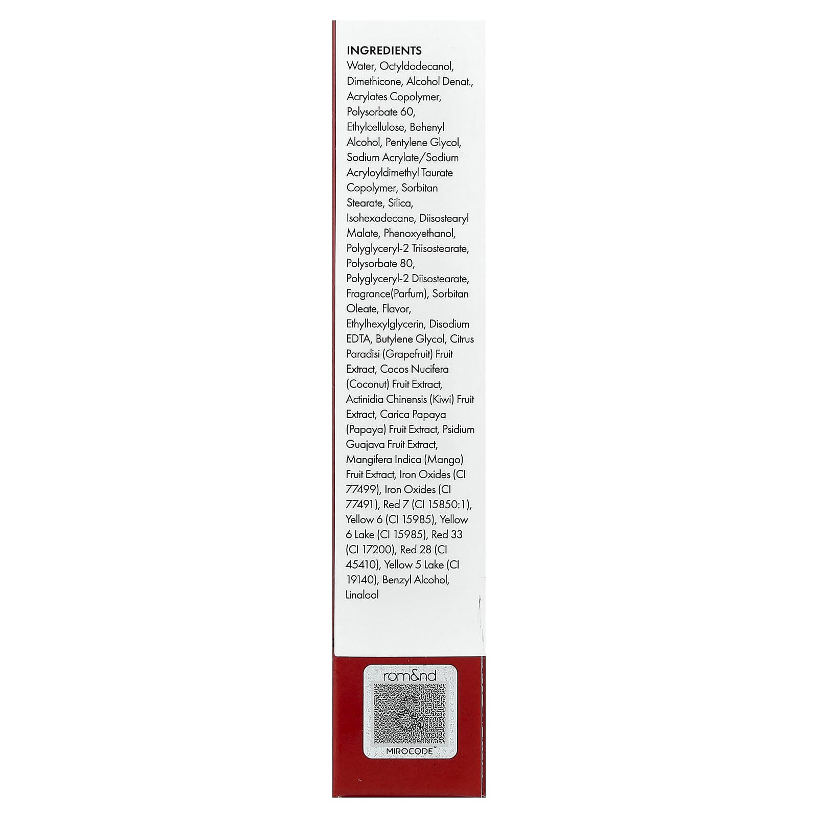 Вода, октилдодеканол, диметикон, денатурированный спирт, сополимер акрилатов, полисорбат 60, этилцеллюлоза, бегениловый спирт, пентилен гликоль, натрий акрилат/натрий акрилоилдиметилтаурат сополимер, сорбитан стеарат, диоксид кремния, изогексадекан, диизостеарил малат, феноксиэтанол, полиглицерил-2 триизостеарат, полисорбат 80, полиглицерил-2 диизостеарат, отдушка (парфюмерная композиция), сорбитанолеат, ароматизатор, этилгексилглицерин, двунатриевая ЭДТК, бутиленгликоль, экстракт плодов грейпфрута (Citrus paradisi), экстракт кокоса (Cocos nucifera), экстракт плодов киви (Actinidia chinensis), экстракт плодов папайи (Carica papaya), экстракт плодов гуавы (Psidium guajava), экстракт плодов манго (Mangifera indica), оксиды железа (CI 77499), оксиды железа (CI 77491), краситель красный 7 (CI 15850:1), краситель желтый 6 (CI 15985), краситель желтый 6 лак (CI 15985), краситель красный 33 (CI 17200), краситель красный 28 (CI 45410), краситель жёлтый 5 лак (CI 19140), бензиловый спирт, линалоола.