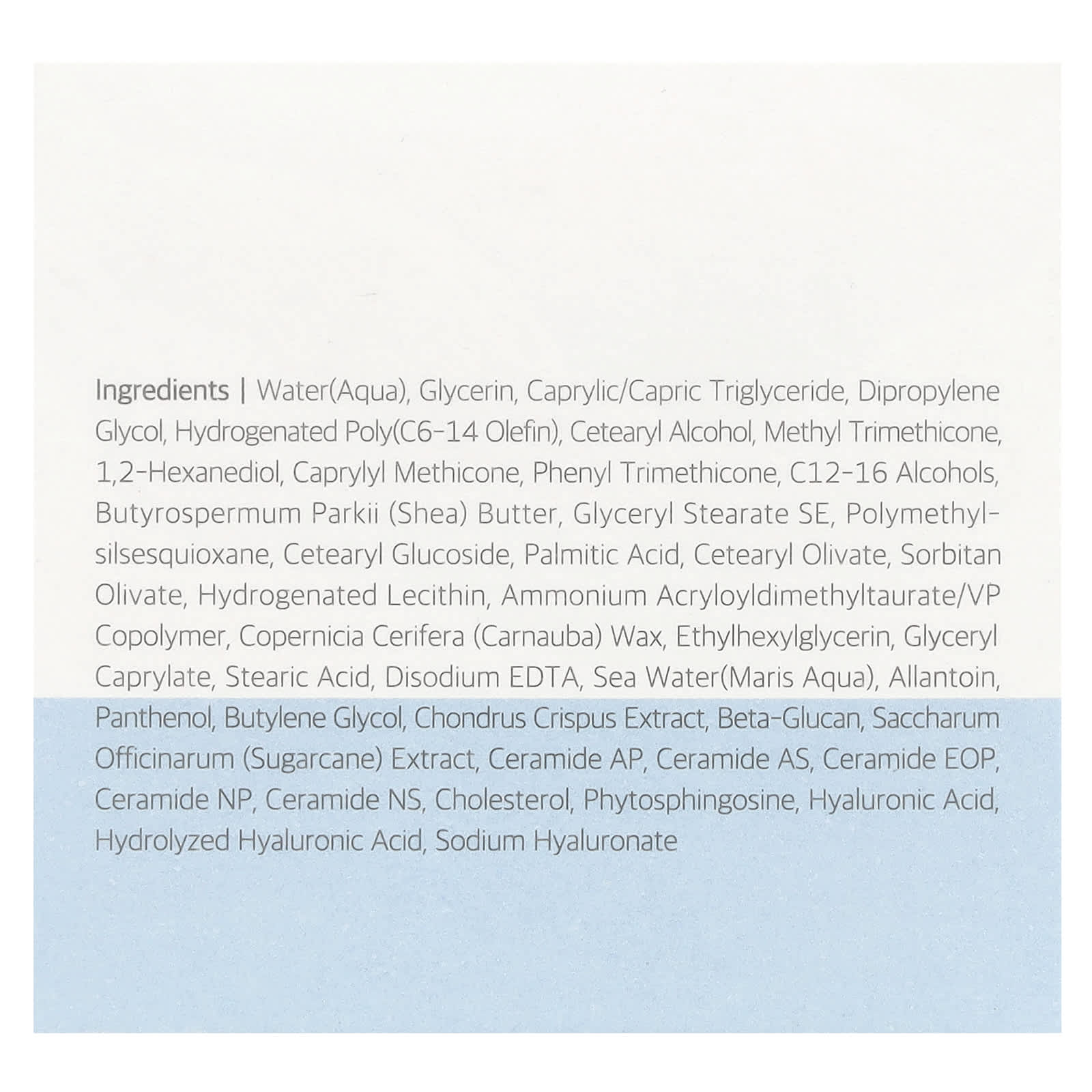 Вода, глицерин, каприловый/каприновый триглицерид, дипропиленгликоль, гидрогенизированный поли (c6-14 олефин), цетеариловый спирт, метил триметикон, 1,2-гександиол, каприлил метикон, фенилтриметикон, c12-16 спирты, масло ши (Butyrospermum parkii), глицерил стеарат эмульгирующий, полиметил силсесквиоксан, цетеариловый глюкозид, пальмитиновая кислота, цетеарил оливат, сорбитан оливат, гидрогенизированный лецитин, аммоний акрилоилдиметилтаурат/ВП сополимер, карнаубский воск (Copernicia cerifera), этилгексилглицерин, глицерил каприлат, стеариновая кислота, двунатриевая ЭДТК, морская вода (Maris aqua), аллантоин, пантенол, бутиленгликоль, экстракт ирландского мха (Chondrus crispus), бета-глюкан, экстракт сахарного тростника (Saccharum officinarum), керамид АP, керамид AS, керамид EOP, керамид NP, керамид NS, холестерин, фитосфингозин, гиалуроновая кислота, гидролизованная гиалуроновая кислота, гиалуронат натрия.
