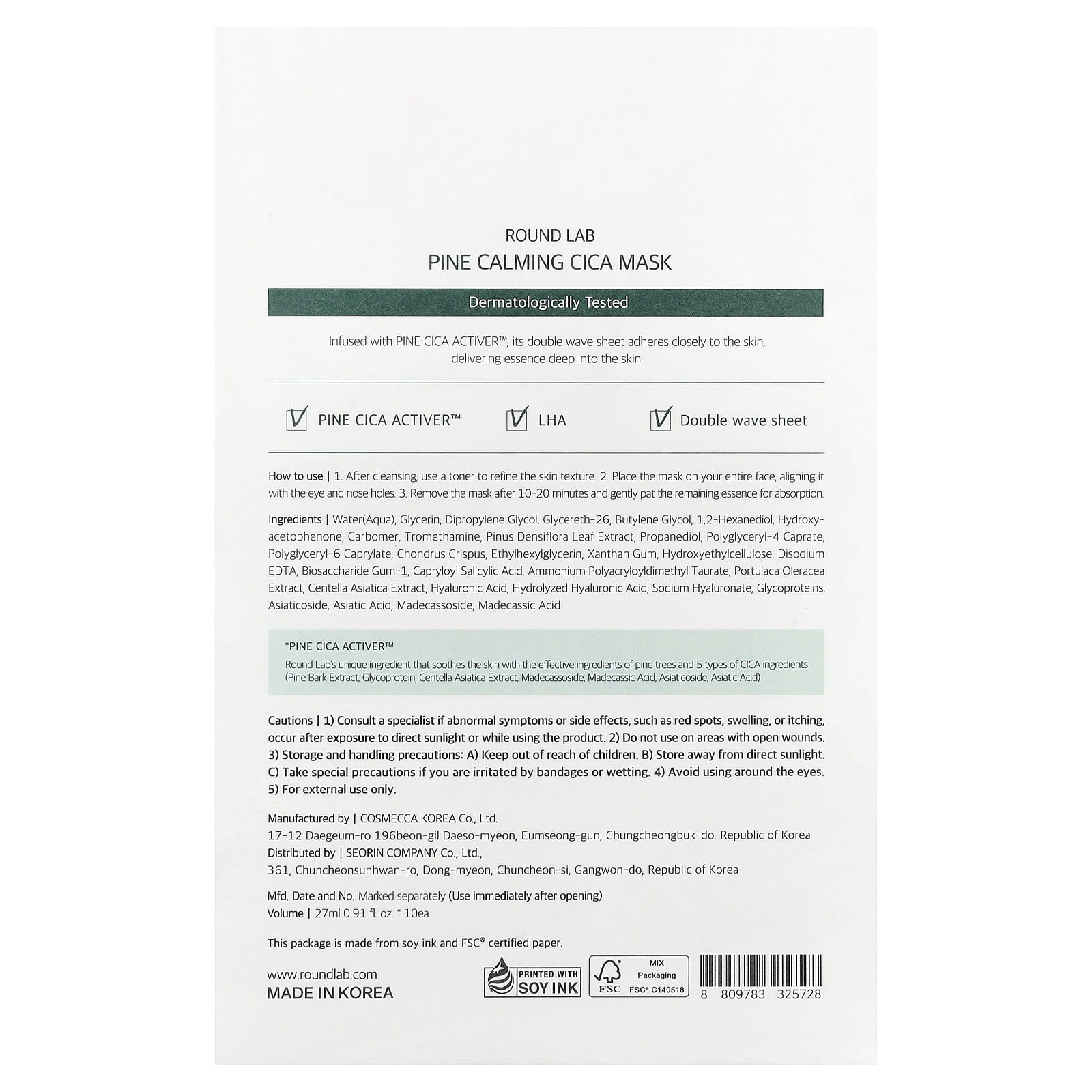 уникальный ингредиент Round Lab, который успокаивает кожу благодаря эффективным ингредиентам сосны и 5 типам ингредиентов CICA (экстракт сосновой коры, гликопротеин, экстракт готу колы (Centella asiatica), мадекассозид, мадекассовая кислота, азиатикозид, азиатиковая кислота).