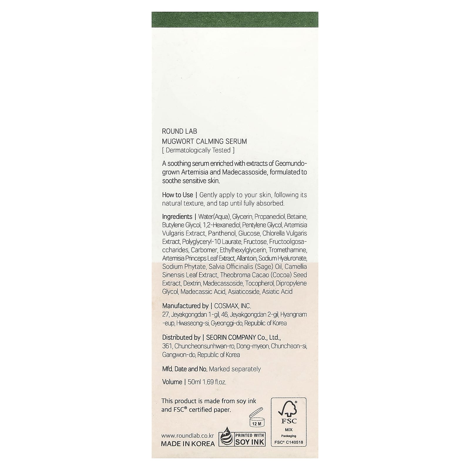 Вода (Aqua), глицерин, пропандиол, бетаин, бутиленгликоль, 1,2-гександиол, пентилен гликоль, экстракт полыни (Artemisia vulgaris), пантенол, глюкоза, экстракт хлореллы (Chlorella vulgaris), полиглицерил-10 лаурат, фруктоза, фруктоолигосахариды, карбомер, этилгексилглицерин, трометамин, экстракт листьев полыни корейской (Artemisia princeps), аллантоин, гиалуронат натрия, фитат натрия, масло шалфея (Salvia officinalis), экстракт листьев зелёного чая (Camellia sinensis), экстракт зерен какао (Theobroma cacao), декстрин, мадекассосид, токоферол, дипропиленгликоль, мадекассовая кислота, азиатикозид, азиатиковая кислота.