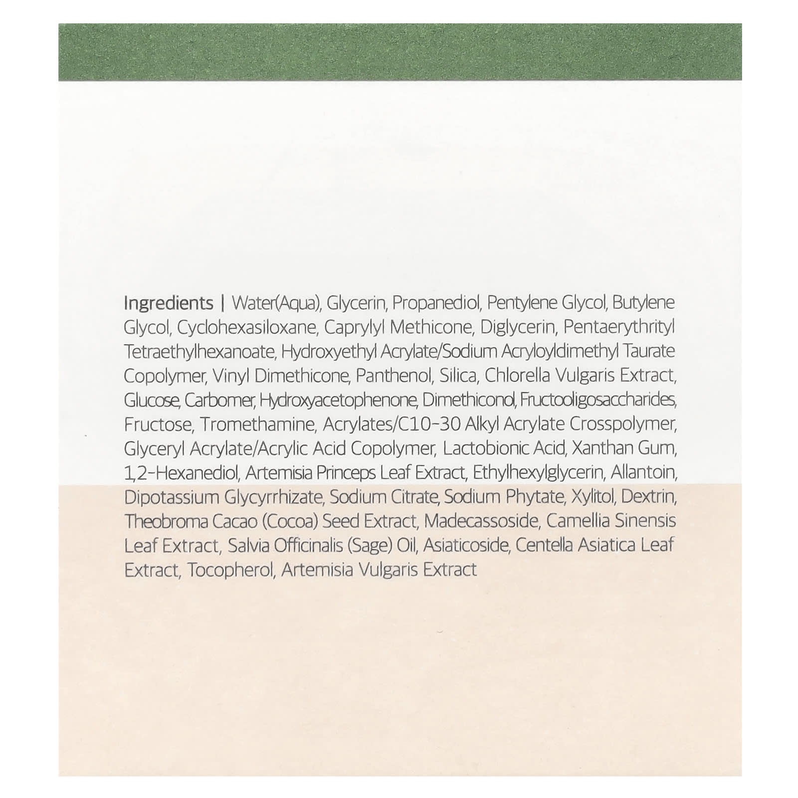 Вода (Aqua), глицерин, пропандиол, пентилен гликоль, бутиленгликоль, циклогексасилоксан, каприлил метикон, диглицерин, пентаэритритил тетраэтилгексаноат, гидроксиэтил акрилат/натрия акрилоилдиметилтаурата сополимер, винил диметикон, пантенол, диоксид кремния, экстракт хлореллы (Chlorella vulgaris), глюкоза, карбомер, гидроксиацетофенон, диметиконол, фруктоолигосахариды, фруктоза, трометамин, акрилат/c10-30 алкил акрилат кроссполимер, сополимер глицерил акрилата/акриловой кислоты, лактобионовая кислота, ксантановая камедь, 1,2-гександиол, экстракт листьев полыни корейской (Artemisia princeps), этилгексилглицерин, аллантоин, дикалия глицирризат, цитрат натрия, фитат натрия, ксилитол, декстрин, экстракт зёрен какао (Theobroma cacao), мадекассосид, экстракт листьев зелёного чая (Camellia sinensis), масло шалфея (Salvia officinalis), азиатикозид, экстракт листьев готу колы (Centella asiatica), токоферол, экстракт полыни обыкновенной (Artemisia vulgaris).