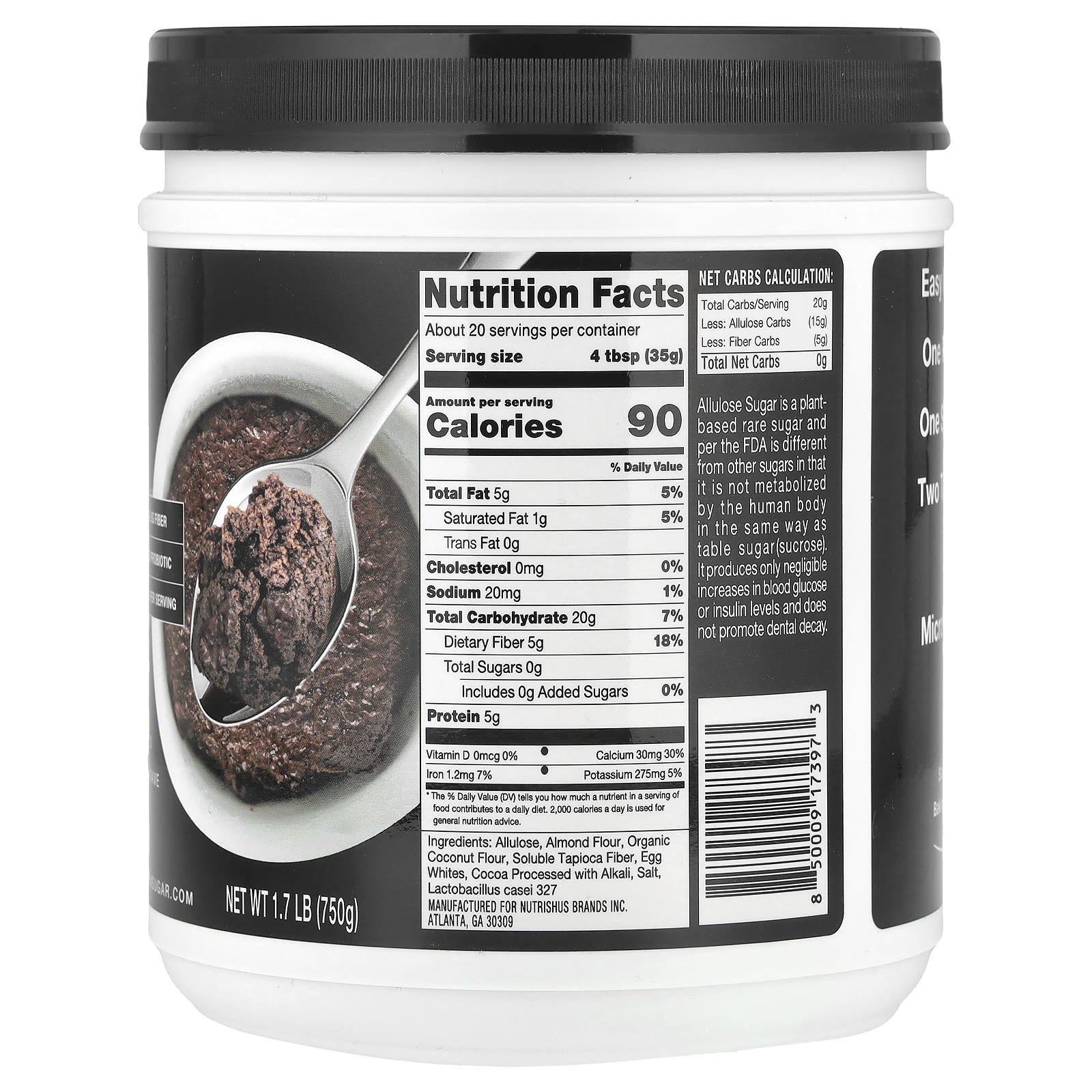 Аллюлоза, миндальная мука, органическая кокосовая мука, растворимая тапиоковая клетчатка, яичный белок, обработанное щелочью какао, соль, Лактобактерии 327.