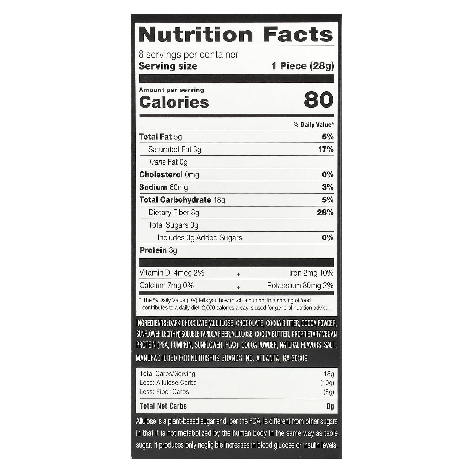 Темный шоколад (аллюлоза, шоколад, какао-масло, какао-порошок, подсолнечный лецитин), растворимая тапиоковая клетчатка, аллюлоза, какао-масло, запатентованный веганский протеин (горох, тыква, подсолнечник, лен, какао-порошок, натуральные ароматизаторы, соль.