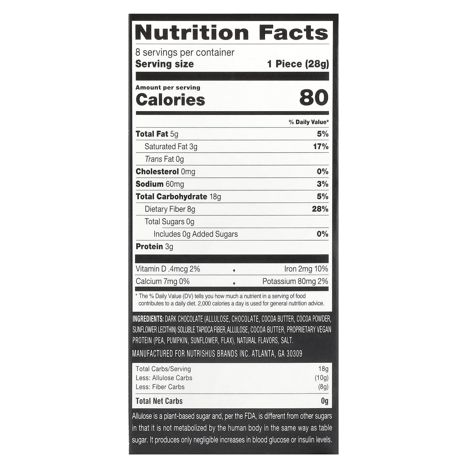 Темный шоколад (аллюлоза, шоколад, какао-масло, какао-порошок, подсолнечный лецитин), растворимая тапиоковая клетчатка, аллюлоза, какао-масло, запатентованный веганский протеин (горох, тыква, подсолнечник, лен, натуральные ароматизаторы, соль.