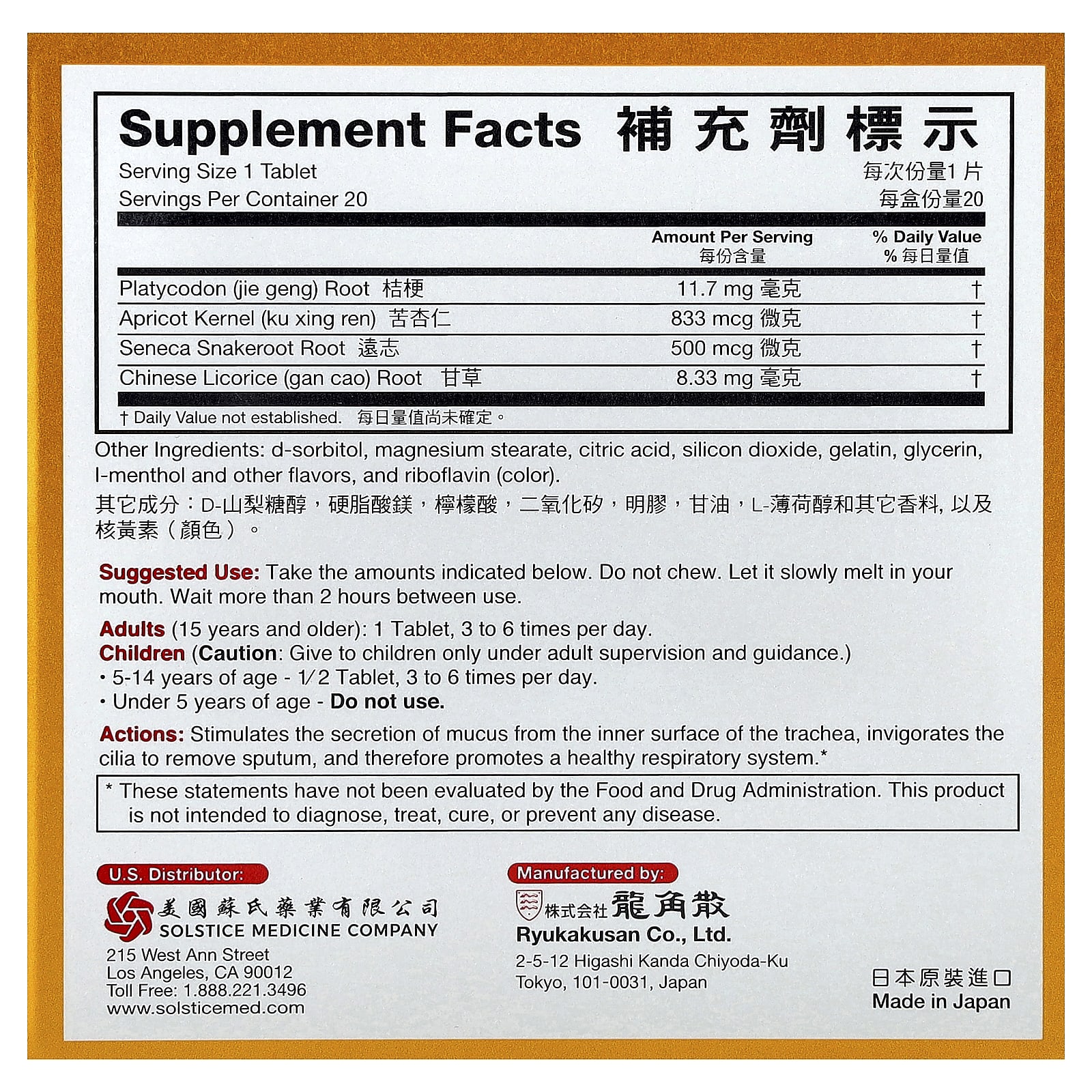 Действия: Стимулирует выделение слизи с внутренней поверхности трахеи, укрепляет реснички для удаления мокроты и, следовательно, способствует здоровью дыхательной системы.