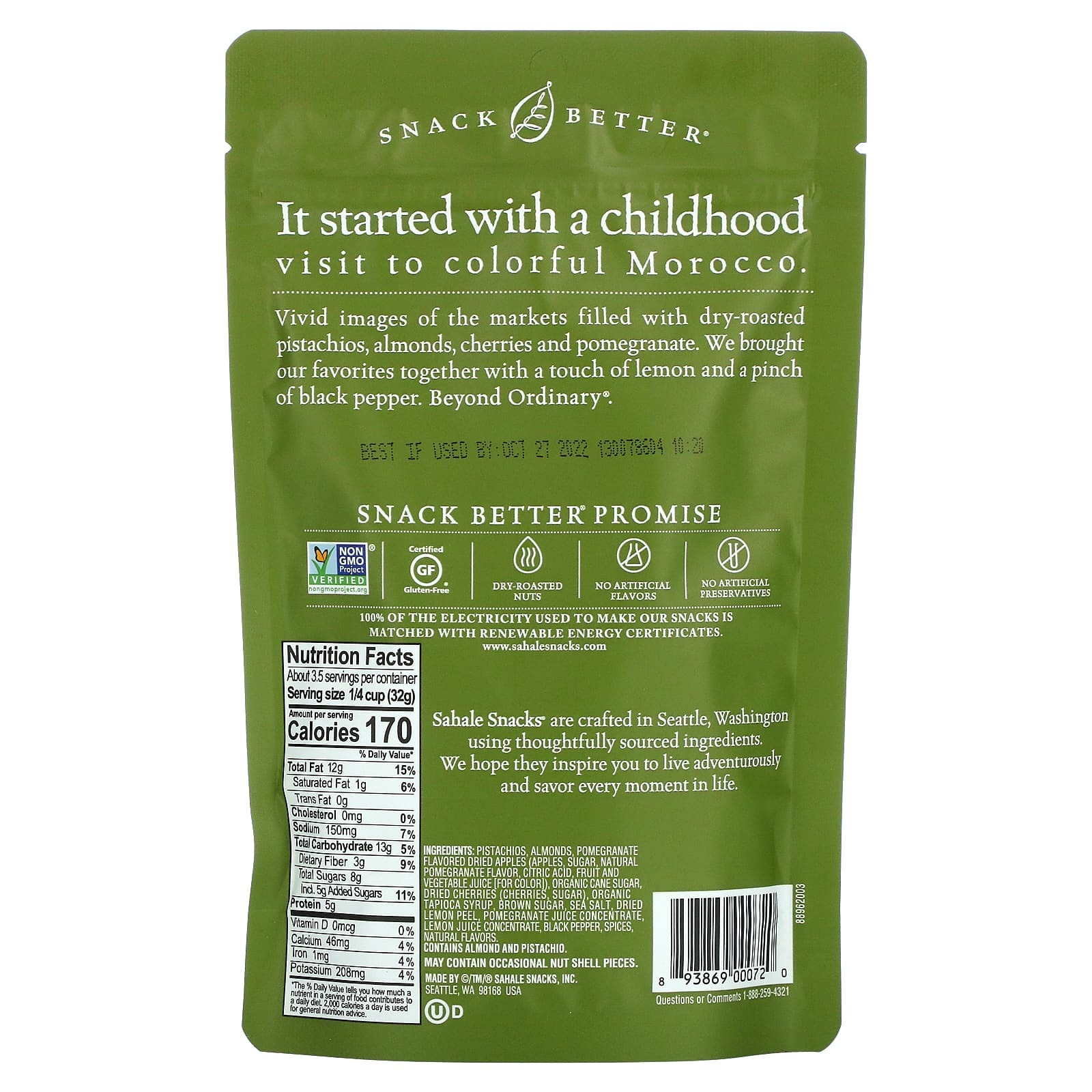 Фисташки, миндаль, сушеные яблоки со вкусом граната (яблоки, сахар, натуральный ароматизатор «Гранат», лимонная кислота, соки из фруктов и овощей [краситель]), органический тростниковый сахар, сушеные вишни (вишни, сахар), органический тапиоковый сироп, коричневый сахар, морская соль, сушеная цедра лимона, концентрат гранатового сока, концентрат лимонного сока, черный перец, специи, натуральные ароматизаторы.