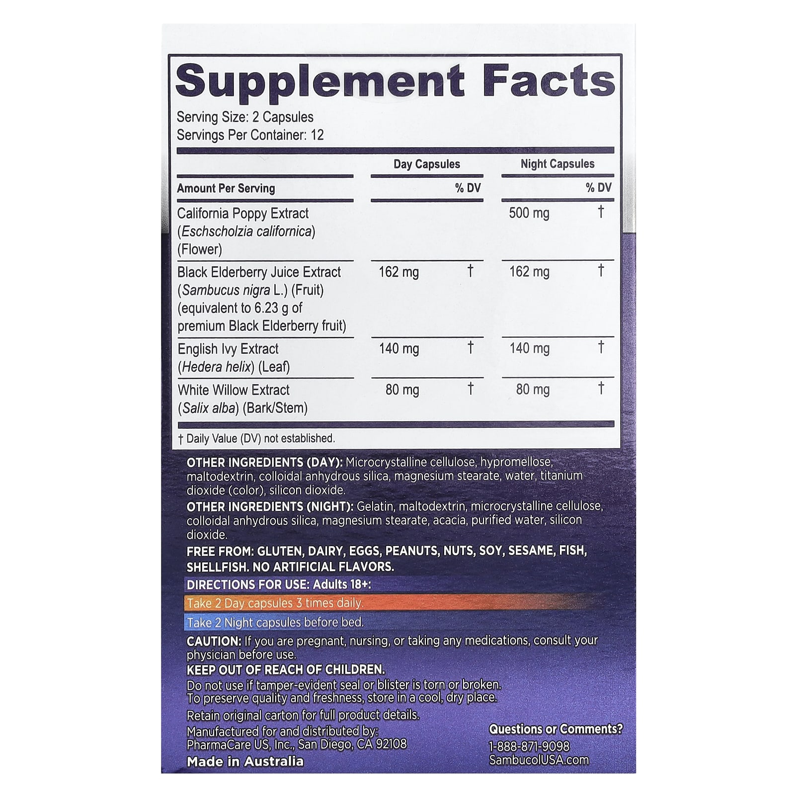 Ночь: Желатин, мальтодекстрин, микрокристаллическая целлюлоза, коллоидный безводный диоксид кремния, стеарат магния, аравийская камедь, очищенная вода, диоксид кремния.