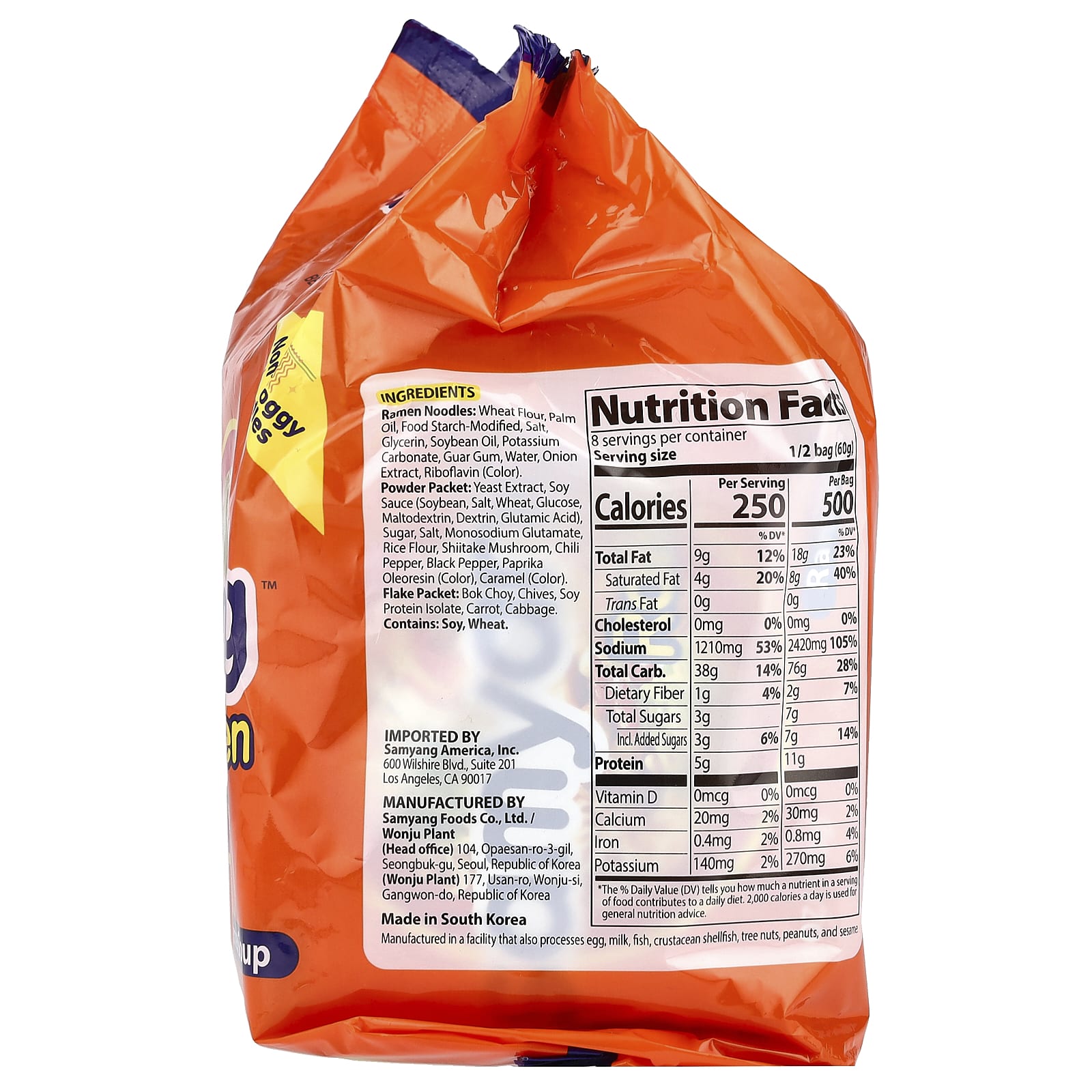 Порошок: дрожжевой экстракт, соевый соус (соевые бобы, соль, пшеницы, глюкоза, мальтодекстрин, декстрин, глутаминовая кислота), сахара, соль, глутамат натрия, рисовая мука, гриб шиитаке, перец чили, черный перец, олеорезин паприки (краситель), карамель (краситель). пакетик хлопьев: бок-чой, чеснок, изолят соевого белка, морковь, капуста.