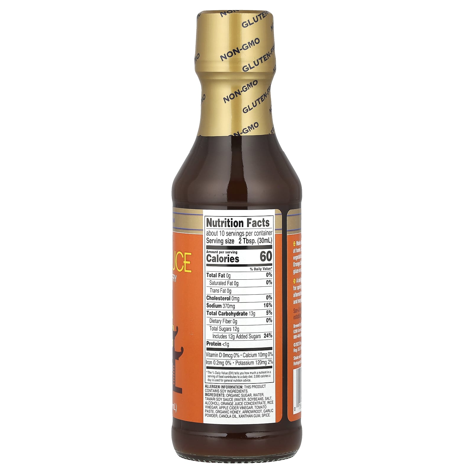 Органический сахар, вода, соевый соус тамари (вода, сою, соль, спирт), концентрат апельсинового сока, рисовый уксус, яблочный уксус, томатная паста, органический мед, аррорут, чесночный порошок, рапсовое масло, ксантановая камедь, специи.