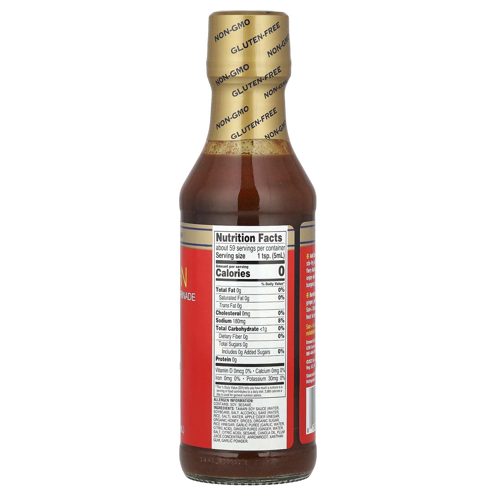 Соевый соус тамари (вода, сою, соль, спирт), саке (вода, рис, соль), вода, яблочный уксус, органический мед, специи, органический сахар, рисовый уксус, чесночное пюре (чеснок, вода, лимонная кислота), имбирное пюре (имбирь, вода, соль, лимонная кислота), кунжута, рапсовое масло, концентрат сливового сока, аррорут, ксантановая камедь, чесночный порошок.
