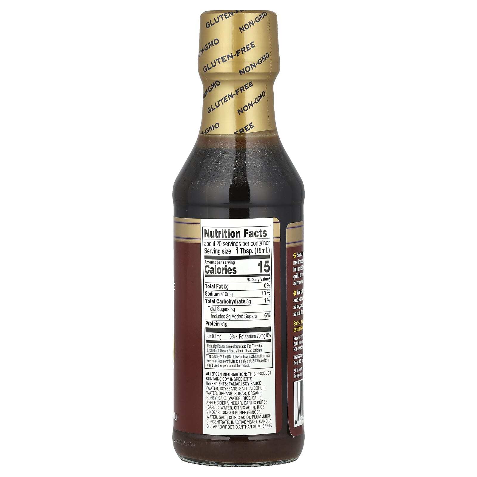 Соевый соус тамари (вода, сою, соль, спирт), вода, органический сахар, органический мед, саке (вода, рис, соль), яблочный уксус, чесночное пюре (чеснок, вода, лимонная кислота), рисовый уксус, имбирное пюре (имбирь, вода, соль, лимонная кислота), концентрат сливового сока, неактивные дрожжи, рапсовое масло, аррорут, ксантановая камедь, специи.