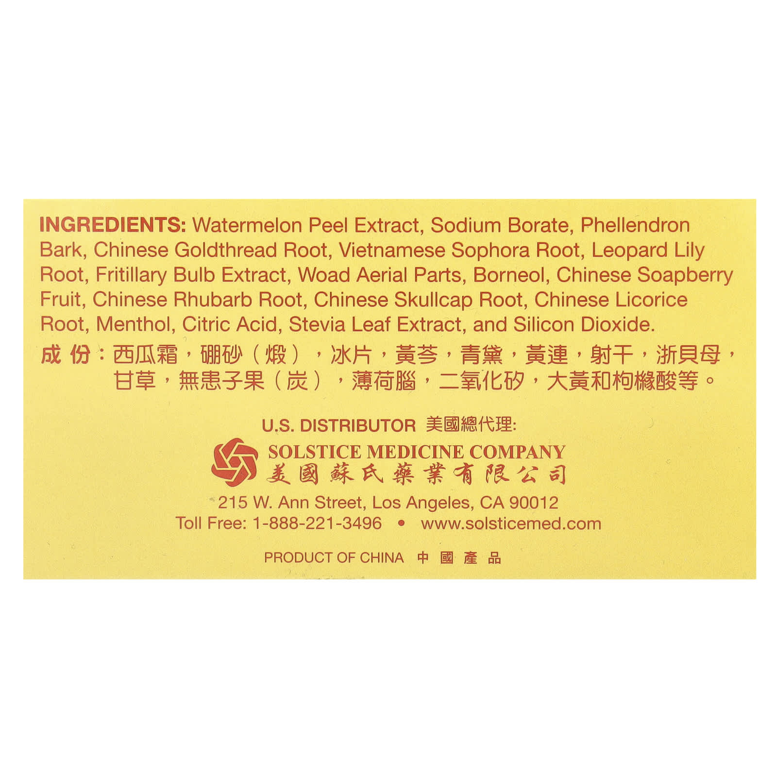 Экстракт цедры арбуза, борат натрия, кора фелендрона, Китайский корень с золотой нитью, Корень софоры вьетнамской, корень леопардовой лилии, экстракт луковиц рябчика, надземные части вайды, борнеол, Плоды китайской мыльницы, Корень китайского ревеня, Китайский корень тюбетейки, Корень солодки китайской, ментол, лимонная кислота, экстракт листьев стевии, диоксид кремния.