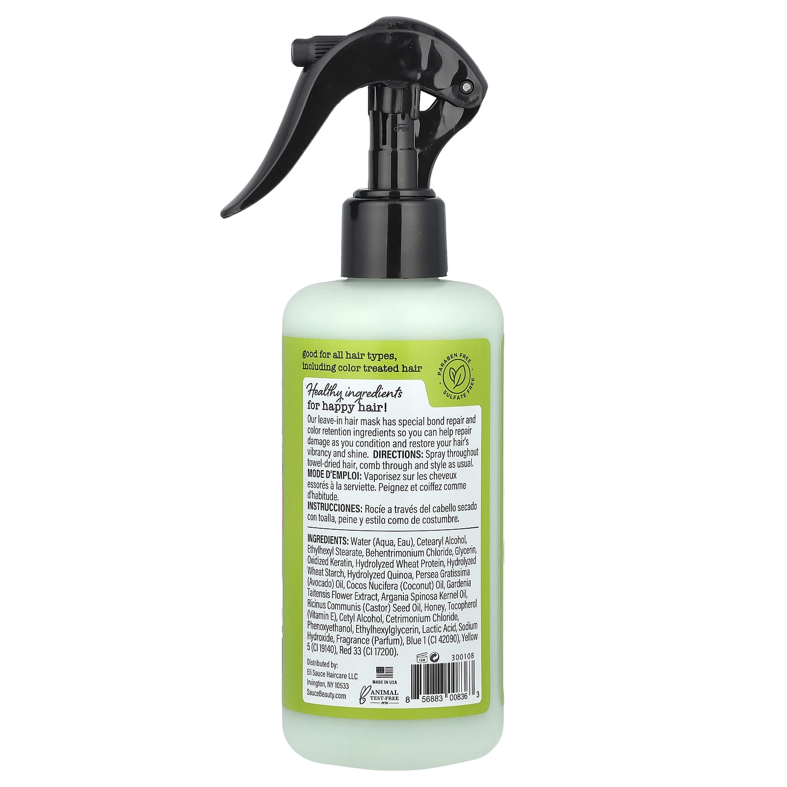 Вода (Aqua, eau), цетеариловый спирт, этилгексил стеарат, бегентримония хлорид, глицерин, окисленный кератин, гидролизованный протеин из пшеницы, гидролизованный пшеничный крахмал, гидролизованное киноа, масло авокадо (Persea gratissima), кокосовое масло (Cocos nucifera), экстракт цветков гардении таитянской (Gardenia tahitensis), аргановое масло (Argania spinosa), касторовое масло (Ricinus communis), мёд, токоферол (витамин E), цетиловый спирт, цетримония хлорид, феноксиэтанол, этилгексилглицерин, молочная кислота, гидроксид натрия, отдушка (парфюмерная композиция), краситель синий 1 (CI 42090), краситель жёлтый 5 (CI 19140), краситель красный 33 (CI 17200).