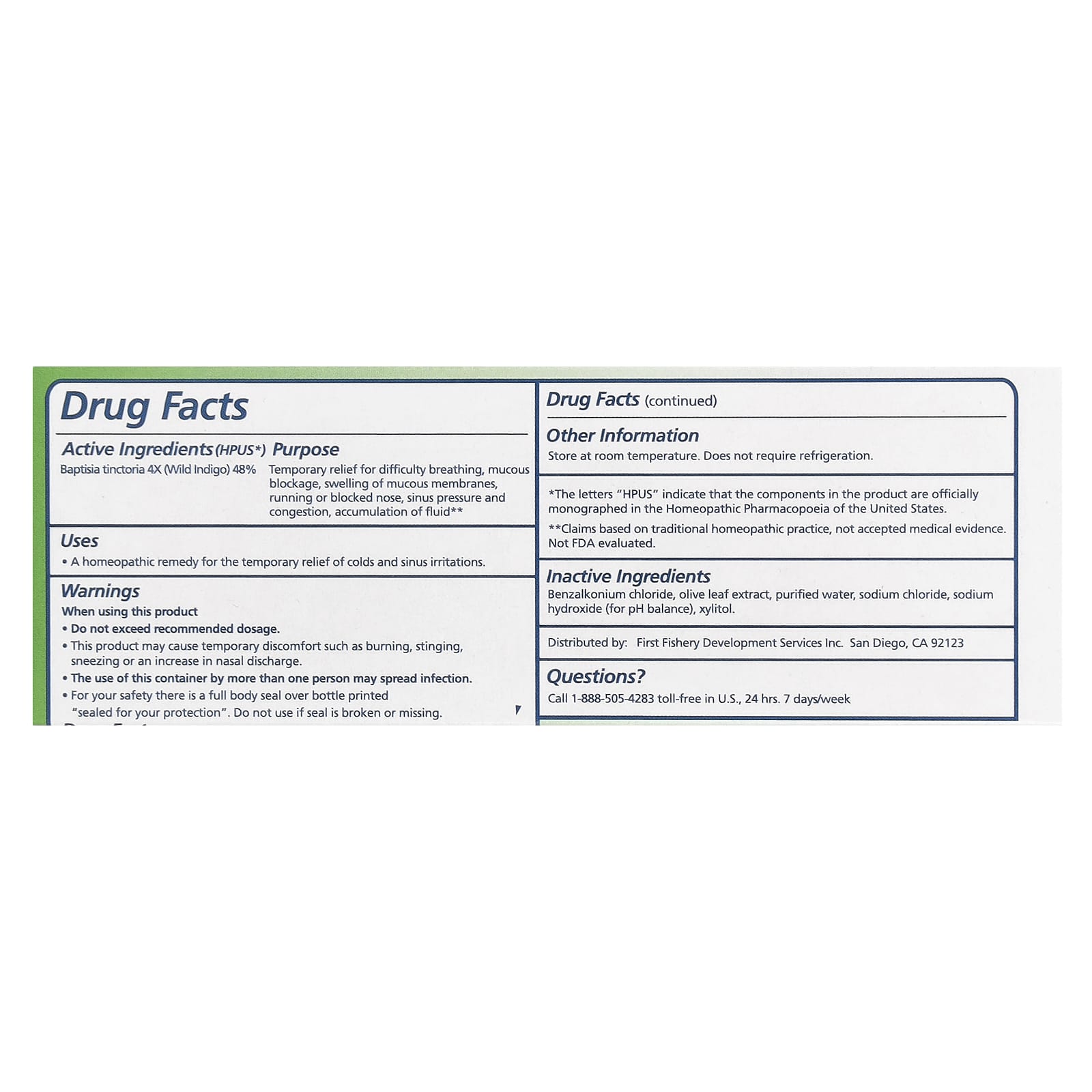 | Baptisia Tinctoria 4x (дикий индиго) 48% | Временное облегчение при затрудненном дыхании, закупорке слизистой оболочки, отеке слизистых оболочек, насморке или заложенности носа, сдавливании и заложенности носовых пазух, скоплении жидкости **. |