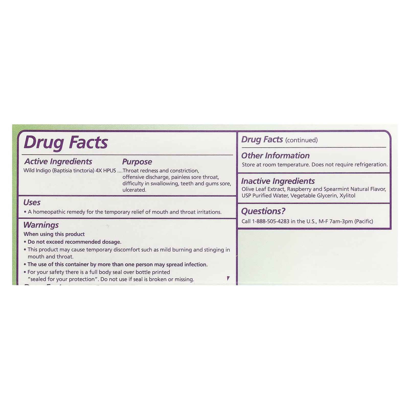 Inactive Ingredients: Olive leaf extract, raspberry and spearmint natural flavor, USP purified water, vegetable glycerin, xylitol.