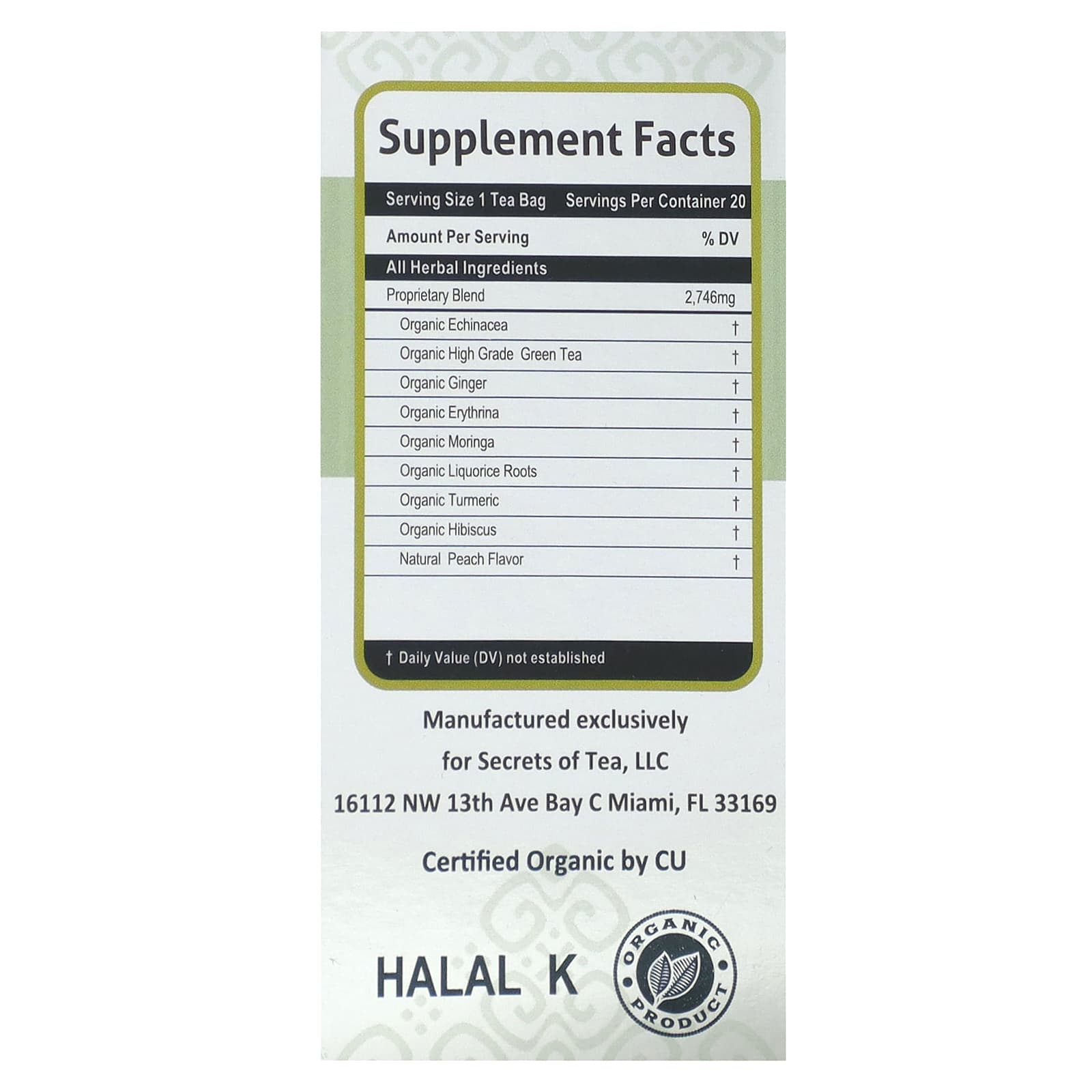 Органическая эхинацея, органический высококачественный зеленый чай, органический имбирь, органическая эритрина, органическая моринга, корни органической солодки, органическая куркума, органический гибискус и натуральный ароматизатор «Персик».