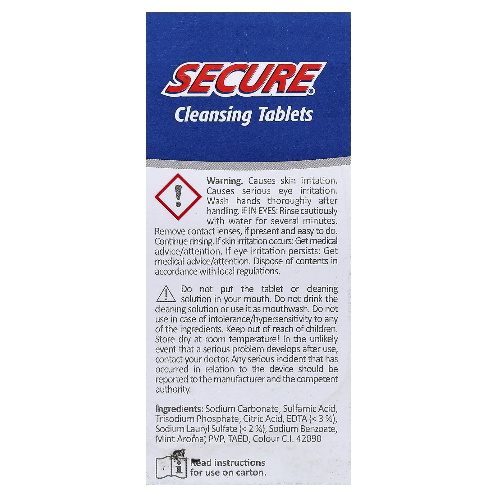 Карбонат натрия, сульфаминовая кислота, тринатрий фосфат, лимонная кислота, ЭДТК (< 3%), лаурилсульфат натрия (< 2%), бензоат натрия, мятный ароматизатор; PvP, taed, краситель CI 42090.