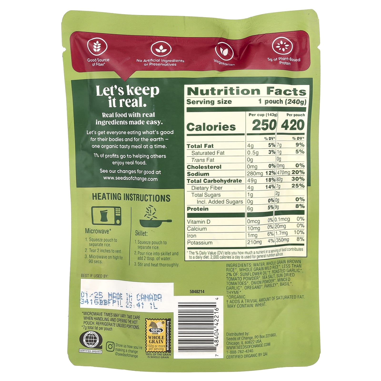 Вода, цельнозерновой коричневый рис *, цельнозерновой дикий рис *; менее 2% подсолнечного масла * †, обжаренный чеснок * томатный порошок *, морская соль, вяленые томаты *, луковый порошок *, рубленый чеснок *, орегано *, петрушка *, базилик *, чабрец *.