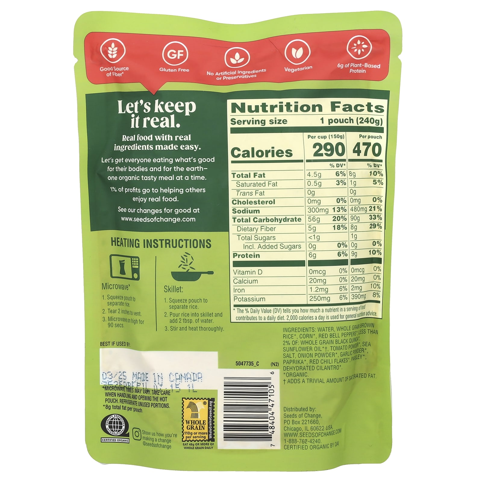 Вода; цельнозерновой коричневый рис; кукуруза *; красный перец *, менее 2% цельнозерновой черной киноа *, подсолнечное масло * †, томатный порошок *, морская соль, луковый порошок *, чесночный порошок *, паприка *, красные хлопья чили *, петрушка *, обезвоженная кинза *.