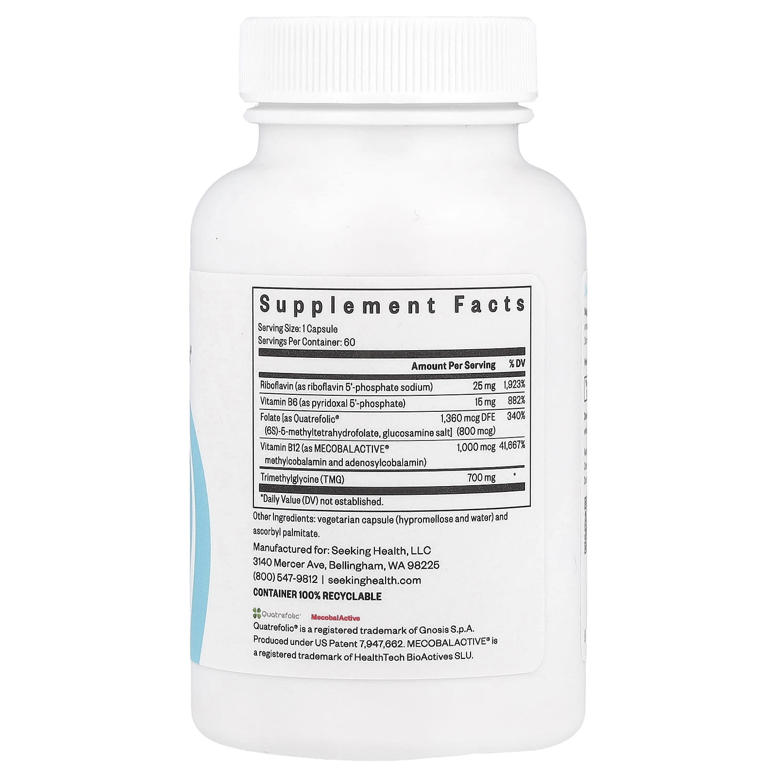 Добавка Homocysteine Nutrients от Seeking Health содержит биоактивные формы четырёх незаменимых витаминов группы B, а также бетаин (триметилглицин или ТМГ). В комплексе эти питательные вещества поддерживают здоровый процесс метилирования и метаболизм гомоцистеина.