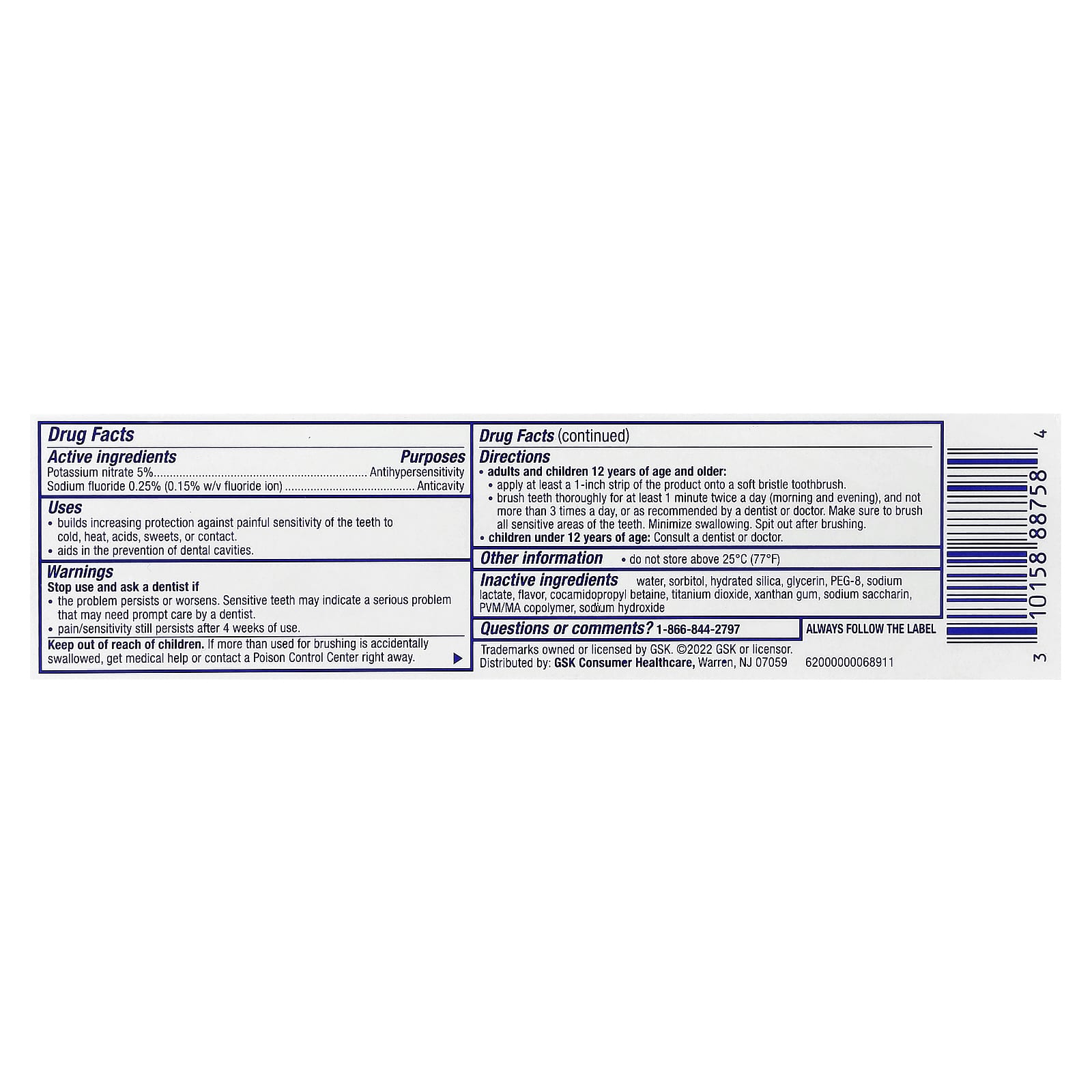| вода, сорбитол, гидратированный диоксид кремния, глицерин, ПЭГ-8, лактат натрия, ароматизатор, кокамидопропилбетаин, диоксид титана, ксантановая камедь, сахарин натрия, ПВМ/МА сополимер, гидроксид натрия. | |