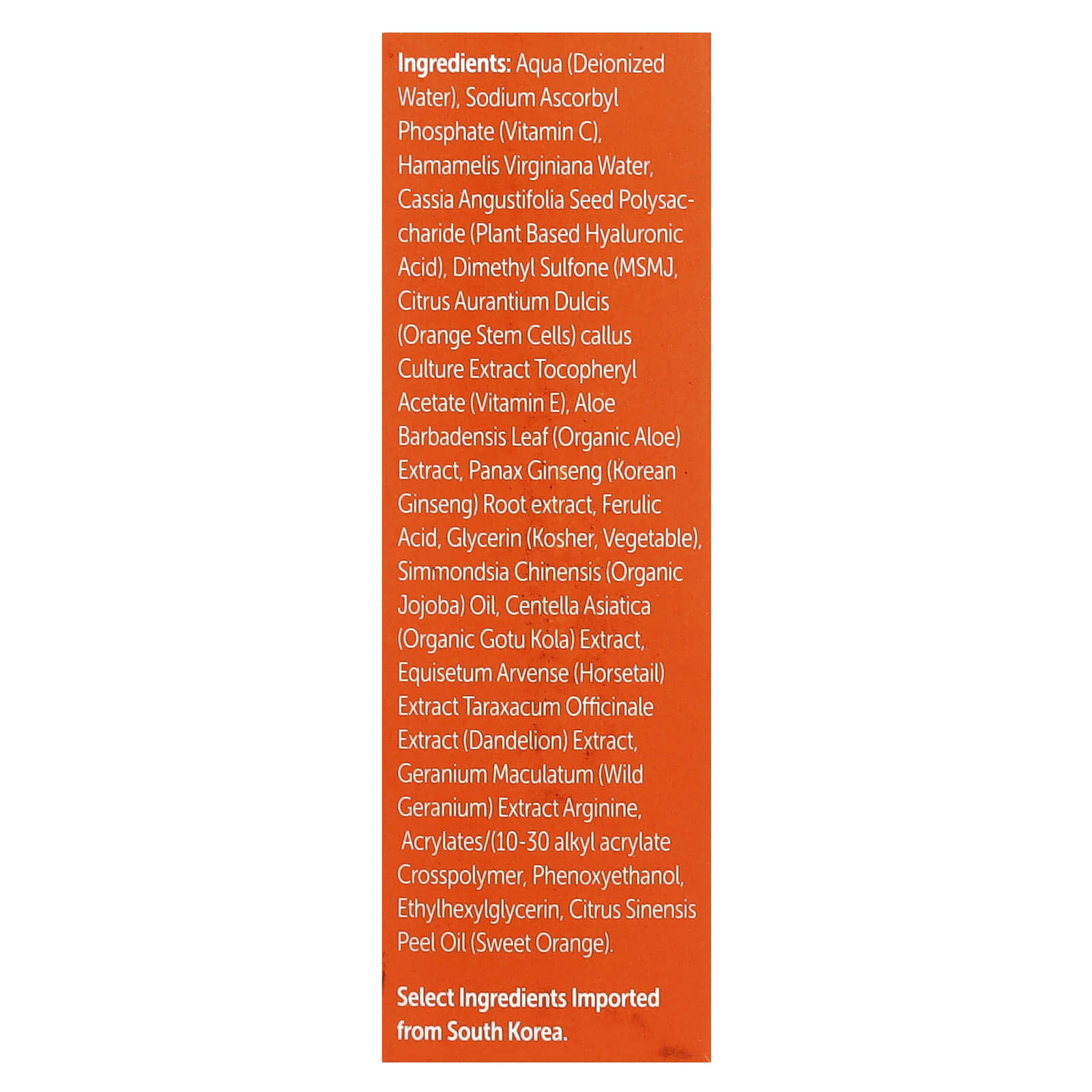 Вода (деионизированная вода), аскорбил фосфат натрия (витамин C), водный раствор гамамелиса виргинского (Hamamelis virginiana), полисахарид из семян сенны александрийской (Cassia angustifolia) (растительная гиалуроновая кислота), диметилсульфон (МСМ), экстракт каллусной культуры стволовых клеток апельсина (Citrus aurantium dulcis), токоферилацетат (витамин E), экстракт листьев алоэ вера (Aloe barbadensis), феруловая кислота, глицерин (кошерный, растительный), органическое масло жожоба (Simmondsia chinensis), экстракт органической готу колы (Centella asiatica), экстракт хвоща полевого (Equisetum arvense), экстракт одуванчика лекарственного (Taraxacum officinale), экстракт герани пятнистой (Geranium maculatum), аргинин, акрилат/c10-30 алкил акрилат кроссполимер, феноксиэтанол, этилгексилглицерин.