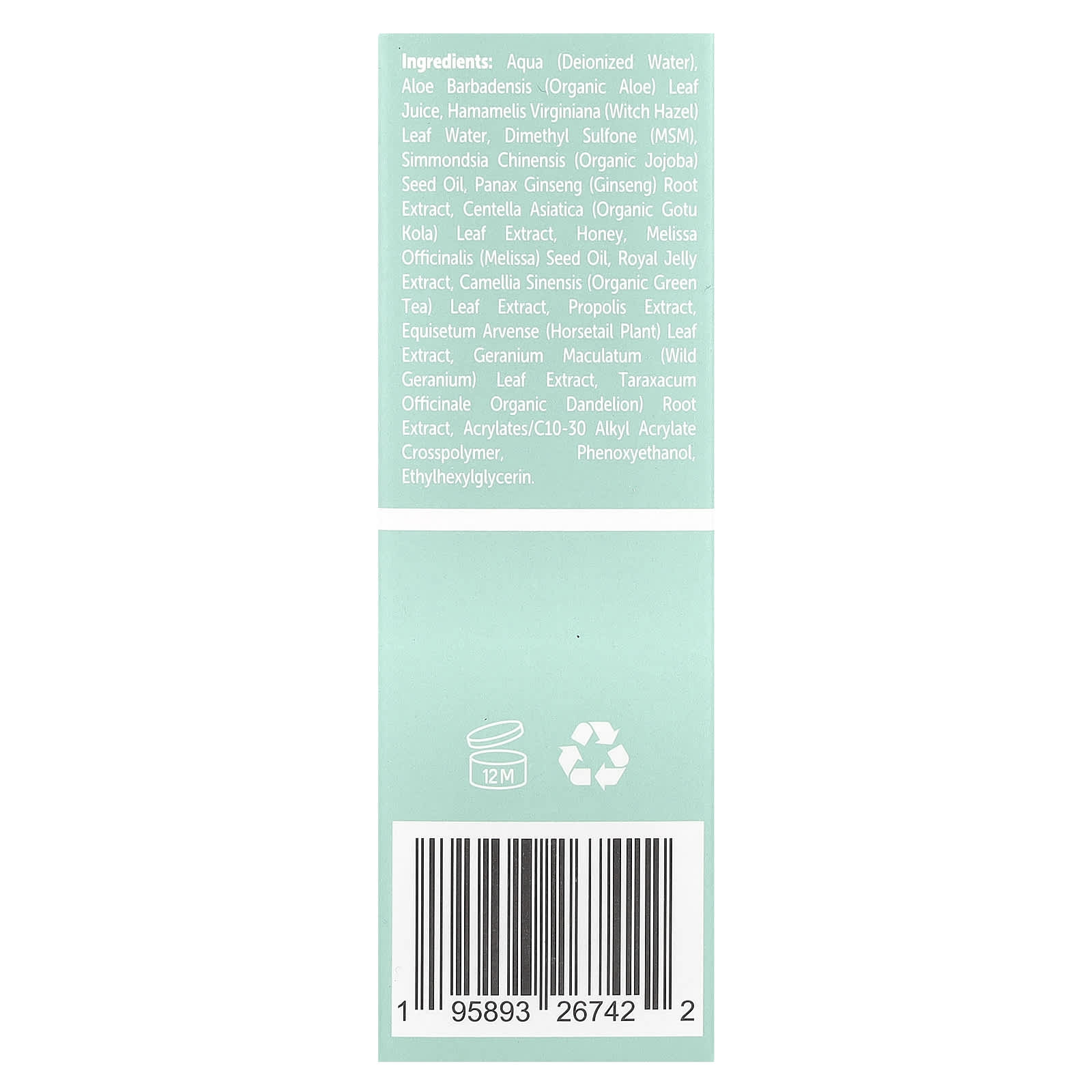 Деионизированная вода (Aqua), сок листьев органического алоэ (Aloe barbadensis), вода из листьев гамамелиса (Hamamelis virginiana), диметилсульфон (МСМ), масло семян жожоба (Simmondsia chinensis), экстракт корня женьшеня (Panax ginseng), экстракт листьев центеллы азиатской (органическая готу кола), мед, масло семян мелиссы лекарственной (Melissa officinalis), экстракт маточного молочка, органический экстракт листьев зеленого чая (Camellia sinensis), экстракт прополиса, экстракт листьев хвоща полевого (Equisetum arvense), экстракт листьев дикой герани (Geranium maculatum), экстракт корня органического одуванчика (Taraxacum officinale), акрилат/c10-30 алкил акрилат кроссполимер, феноксиэтанол, этилгексилглицерин.