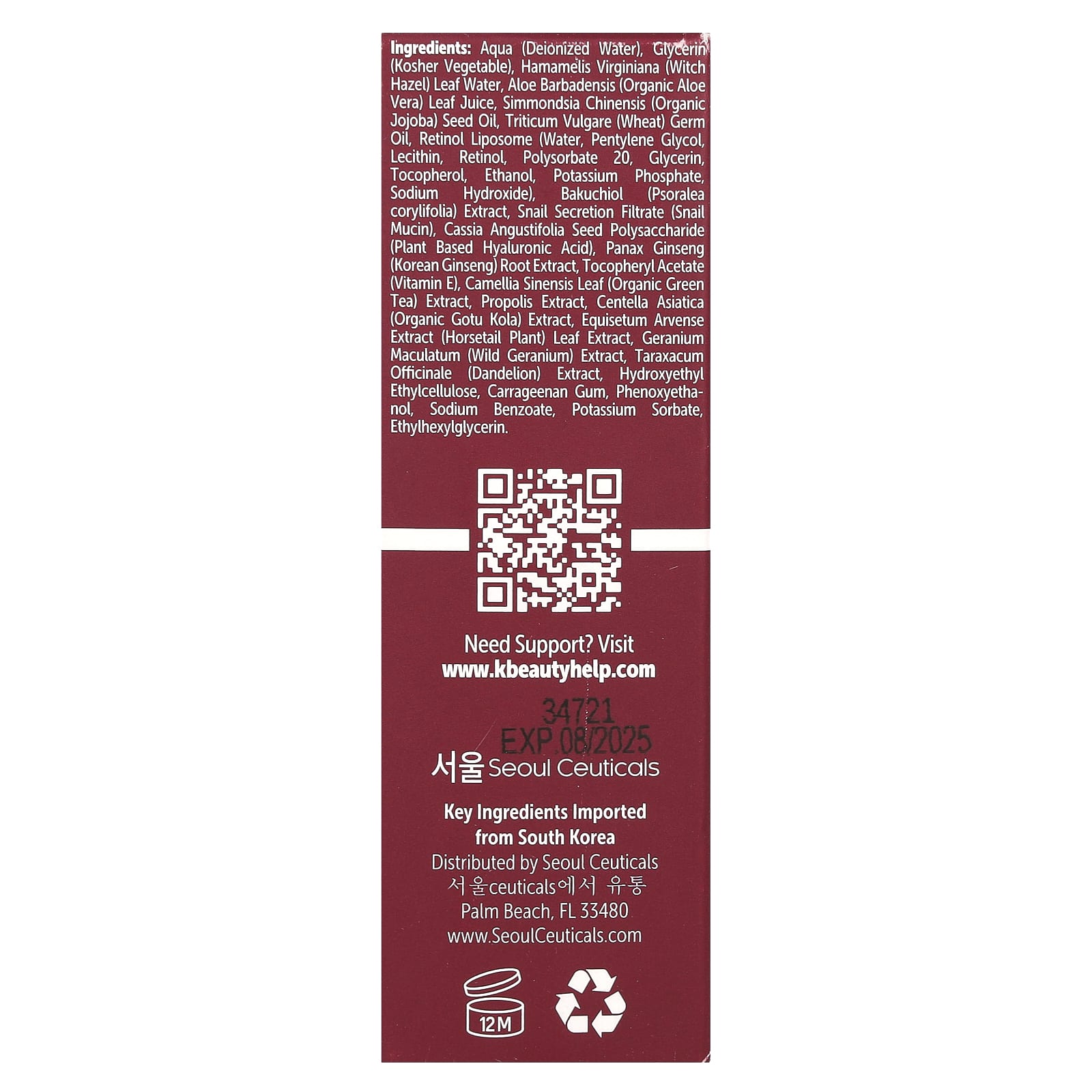 Деионизированная вода, глицерин (растительный, кошерный), вода из листьев гамамелиса (Hamamelis virginiana), сок листьев органического алоэ вера (Aloe barbadensis), органическое масло семян жожоба (Simmondsia chinensis), масло зародышей пшеницы (Triticum vulgare), липосома ретинола (вода, пентилен гликоль, лецитин, ретинол, полисорбат 20, глицерин, токоферол, этанол, фосфат калия, гидроксид натрия), экстракт бакучиола (Psoralea corylifolia), фильтрат секрета улитки (муцин улитки), полисахарид из семян сенны александрийской (Cassia angustifolia) (растительная гиалуроновая кислота), экстракт корня женьшеня корейского (Panax ginseng), токоферилацетат (витамин Е), экстракт листьев органического зеленого чая (Camellia sinensis), экстракт прополиса, экстракт органической готу колы (Centella asiatica), экстракт листьев хвоща полевого (Equisetum arvense), экстракт герани пятнистой (Geranium maculatum), экстракт одуванчика (Taraxacum officinale), гидроксиэтилированная этилцеллюлоза, каррагинановая камедь, феноксиэтанол, бензоат натрия, сорбат калия, этилгексилглицерин.