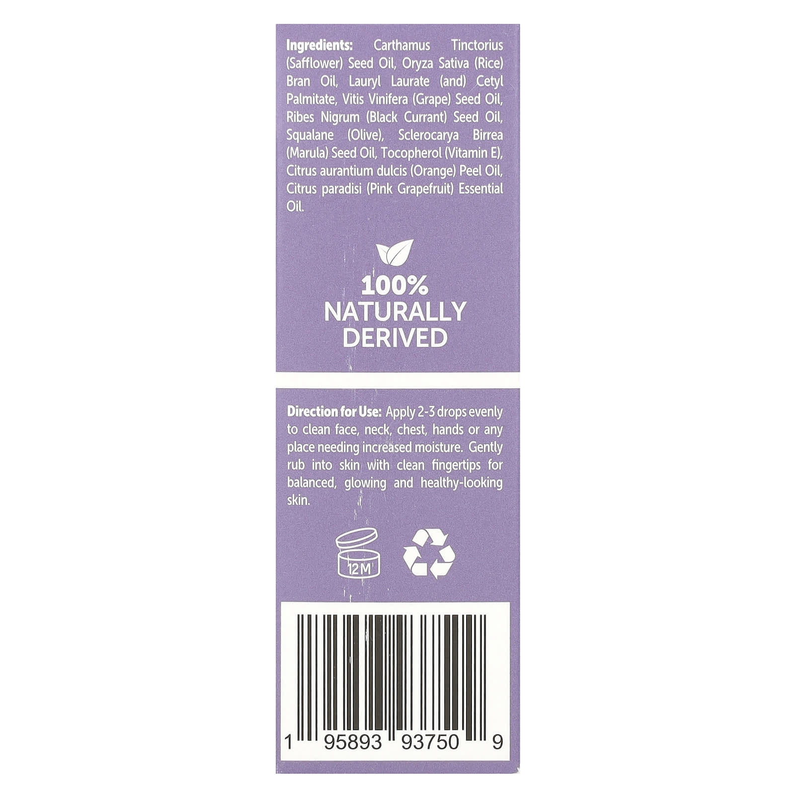 Масло семян сафлора (Carthamus tinctorius), масло из рисовых отрубей (Oryza sativa), лаурил лаурат и цетилпальмитат, масло из виноградных косточек (Vitis vinifera), масло из косточек черной смородины (Ribes nigrum), сквалан (из оливкового масла), масло из семян марулы (Sclerocarya birrea), токоферол (витамин Е), масло из цедры апельсина (Citrus aurantium dulcis), эфирное масло розового грейпфрута (Citrus paradisi).