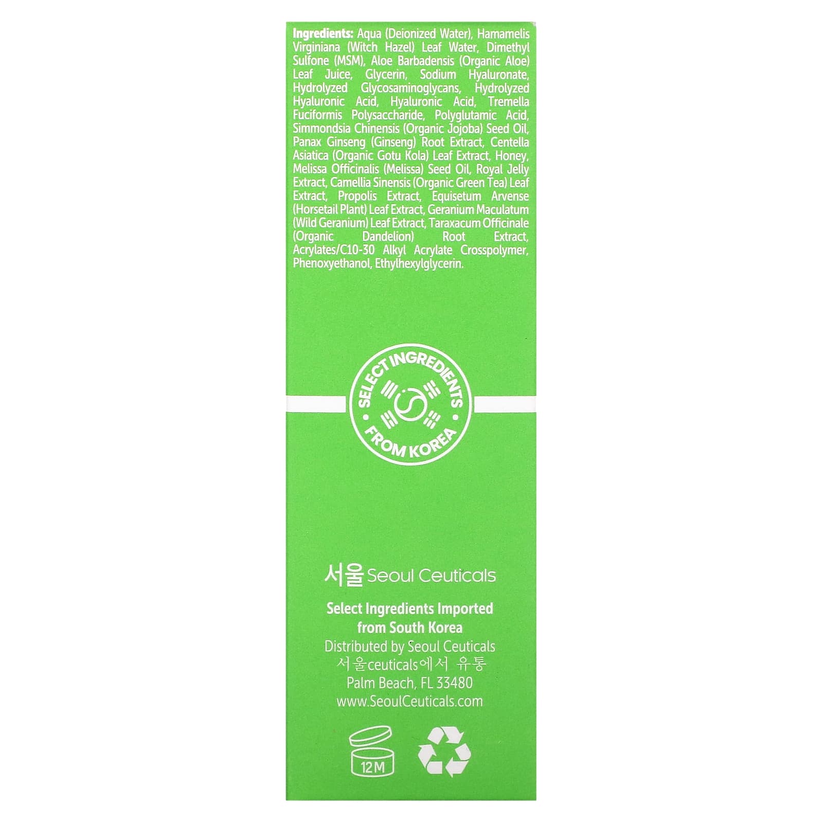 Деионизированная вода, вода из листьев гамамелиса (Hamamelis virginiana), диметилсульфон (МСМ), сок листьев органического алоэ (Aloe barbadensis), глицерин, гиалуронат натрия, гидролизованные гликозаминогликаны, гидролизованная гиалуроновая кислота, гиалуроновая кислота, полисахарид грибов тремелла (Tremella fuciformis), полиглутаминовая кислота, масло семян жожоба (Simmondsia chinensis), экстракт корня женьшеня (Panax ginseng), экстракт листьев центеллы азиатской (органическая готу кола), мед, масло семян мелиссы лекарственной (Melissa officinalis), экстракт маточного молочка, органический экстракт листьев зеленого чая (Camellia sinensis), экстракт прополиса, хвощ полевой) экстракт листьев, экстракт листьев дикой герани (Geranium maculatum), экстракт корня органического одуванчика (Taraxacum officinale), акрилат/c10-30 алкил акрилат кроссполимер, феноксиэтанол, этилгексилглицерин.