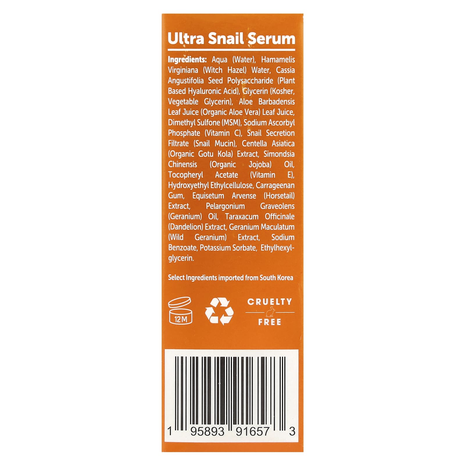Вода (Aqua), вода из гамамелиса (Hamamelis virginiana), полисахарид семян кассии узколистной (растительная гиалуроновая кислота), глицерин (кошерный, растительный глицерин), сок листьев алоэ вера (Aloe barbadensis), диметилсульфон (МСМ), аскорбил фосфат натрия (витамин С), фильтрат секрета улитки (муцин улитки), экстракт центеллы азиатской (органическая готу кола), органическое масло жожоба (Simondsia chinensis), токоферилацетат (витамин Е), гидроксиэтил этилцеллюлоза, каррагинановая камедь, экстракт хвоща полевого (Equisetum arvense), гераниевое масло (Pelargonium graveolens), экстракт одуванчика (Taraxacum officinale), экстракт дикой герани (Geranium maculatum), бензоат натрия, сорбат калия, этилгексилглицерин.