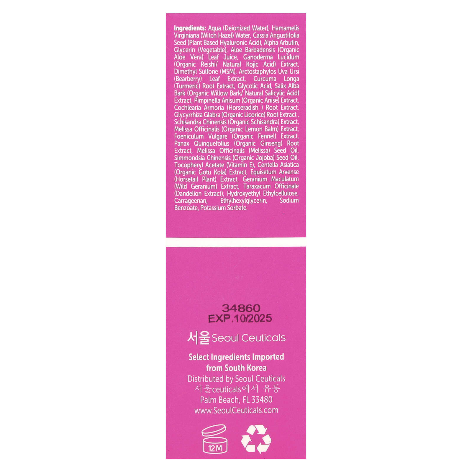 Деионизированная вода (Aqua), вода из гамамелиса (Hamamelis virginiana), гиалуроновая кислота на растительной основе (Cassia angustifolia), альфа-арбутин, глицерин (растительный), сок листьев органического алоэ вера (Aloe barbadensis), экстракт трутовика лакированного (Ganoderma lucidum) (органический рейши или натуральная койевая кислота), диметилсульфон (МСМ), экстракт листьев толокнянки обыкновенной (Arctostaphylos uva-ursi), экстракт корня куркумы (Curcuma longa), гликолевая кислота, экстракт коры органической ивы (Salix alba) (натуральная салициловая кислота), экстракт органического аниса (Pimpinella anisum), экстракт корня хрена (Cochlearia Armoria), экстракт корня органической солодки (Glycyrrhiza glabra) , экстракт органического лимонника (Schisandra chinensis), экстракт органической мелиссы лекарственной (Melissa officinalis), экстракт органического фенхеля (Foeniculum vulgare), экстракт корня органической женьшеня (Panax quinquefolius), масло семян мелиссы (Melissa officinalis), органическое масло семян жожоба (Simmondsia chinensis), токоферилацетат (витамин Е), экстракт органической готу колы (Centella asiatica), экстракт растения хвоща полевого (Equisetum arvense), экстракт герани пятнистой (Geranium maculatum), экстракт одуванчика (Taraxacum officinale), гидроксиэтилированная этилцеллюлоза, каррагинан, этилгексилглицерин, бензоат натрия, сорбат калия.