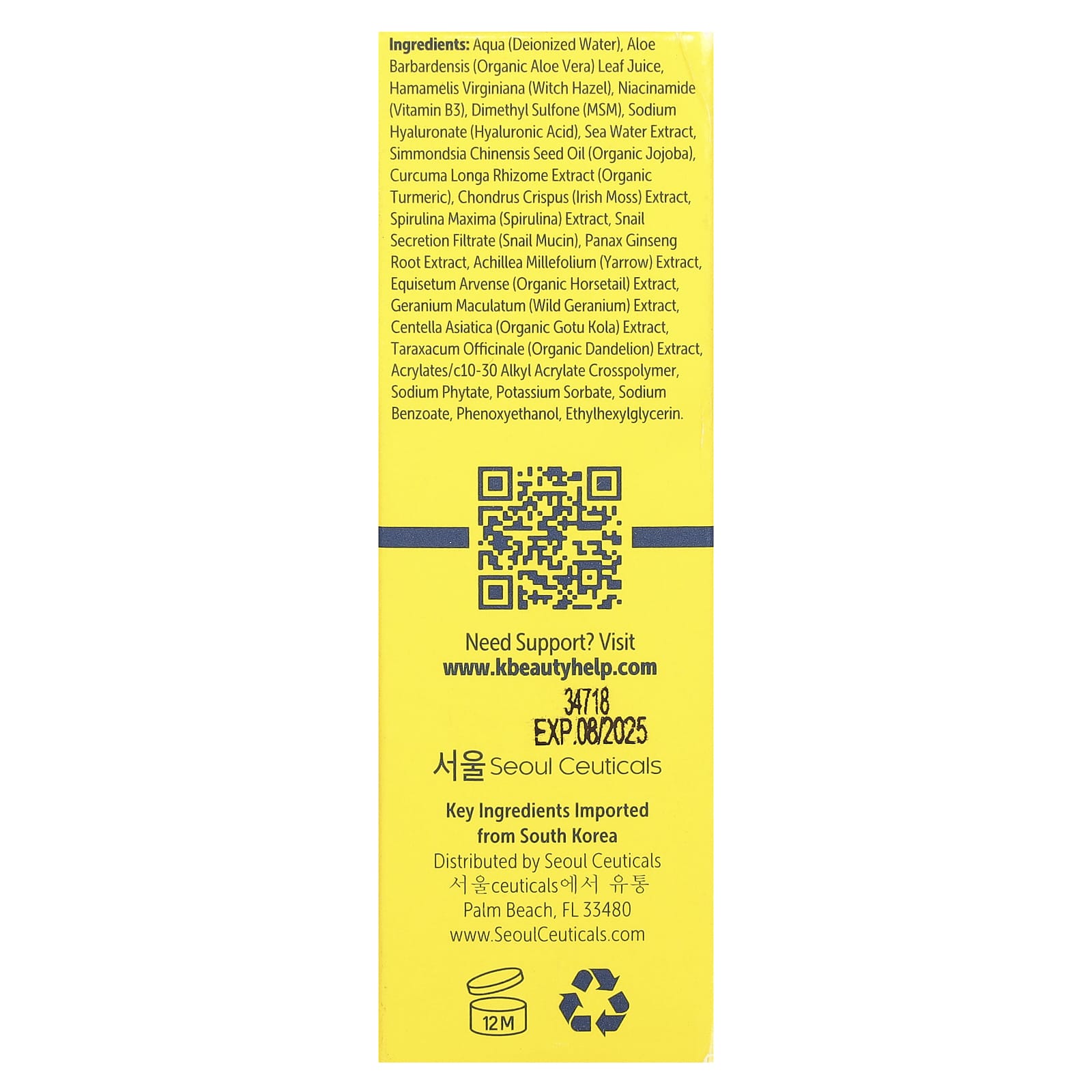 Деионизированная вода, сок листьев органического алоэ вера (Aloe barbadensis), гамамелис (Hamamelis virginiana), никотинамид (витамин B3), диметилсульфон (МСМ), гиалуронат натрия (гиалуроновая кислота), экстракт морской воды, органическое масло семян жожоба (Simmondsia chinensis), экстракт корневища органической куркумы (Curcuma longa), экстракт ирландского мха (Chondrus crispus), экстракт спирулины (Spirulina maxima), фильтрат секрета улитки (муцин улитки), экстракт корня женьшеня (Panax ginseng), экстракт тысячелистника (Achillea millefolium), органический экстракт хвоща полевого (Equisetum arvense), экстракт герани пятнистой (Geranium maculatum), экстракт органической готу колы (Centella asiatica), экстракт органического одуванчика (Taraxacum officinale), акрилат/c10-30 алкил акрилат кроссполимер, фитат натрия, сорбат калия, бензоат натрия, феноксиэтанол, этилгексилглицерин.