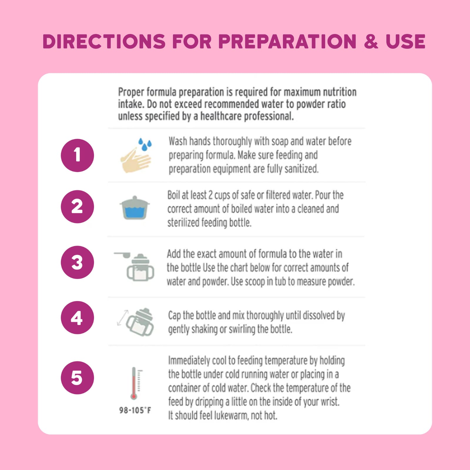 Для максимального потребления питательных веществ требуется правильное приготовление смеси. Не превышайте рекомендуемое соотношение воды и порошка, за исключением случаев, когда это рекомендовано медицинским работником.