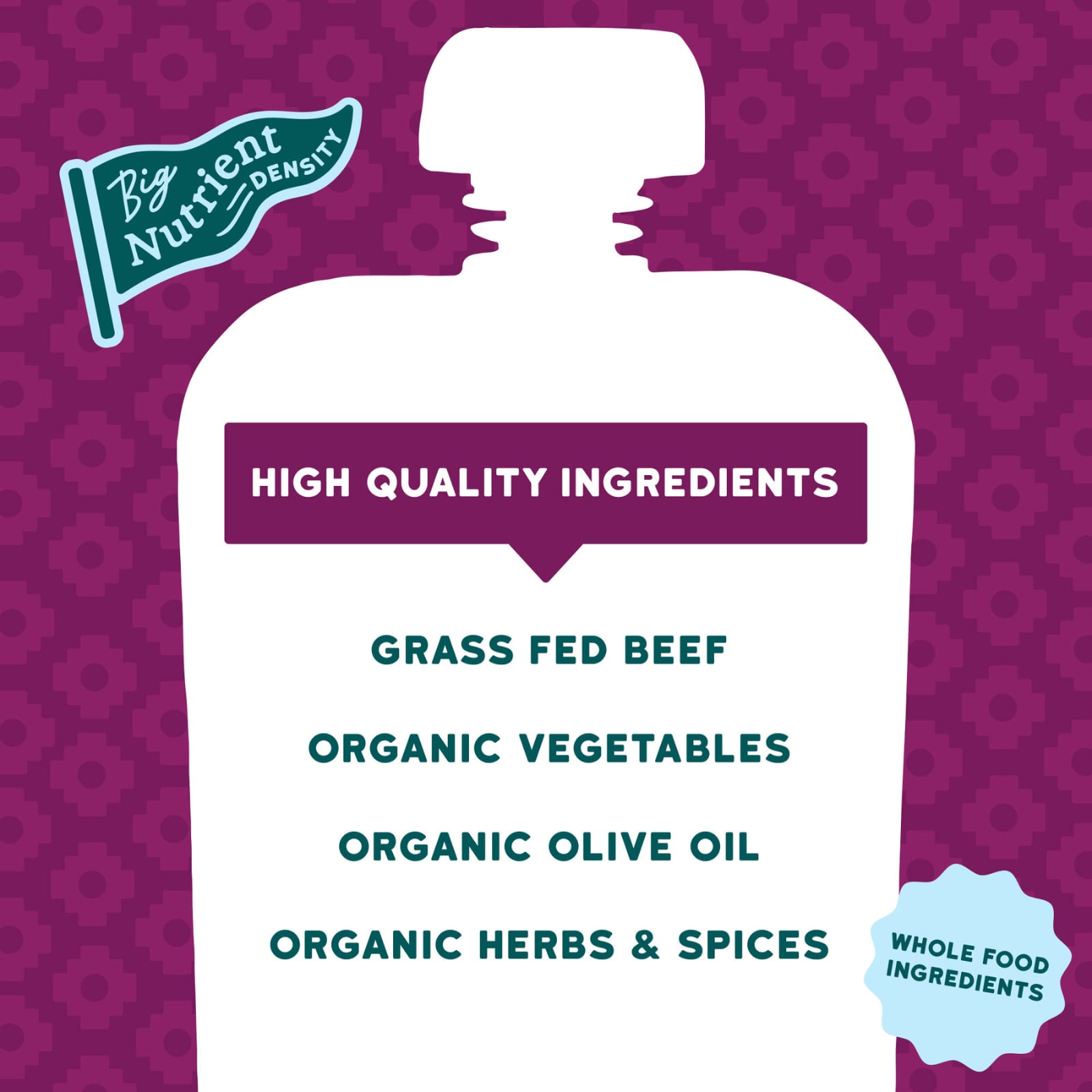 Органическая морковь, вода, говядина травяного откорма, органический белый картофель, органическая зеленая фасоль, органическое оливковое масло, органический яблочный уксус, органическая петрушка, органический чеснок, органический кориандр, Гималайская морская соль, органический черный перец.