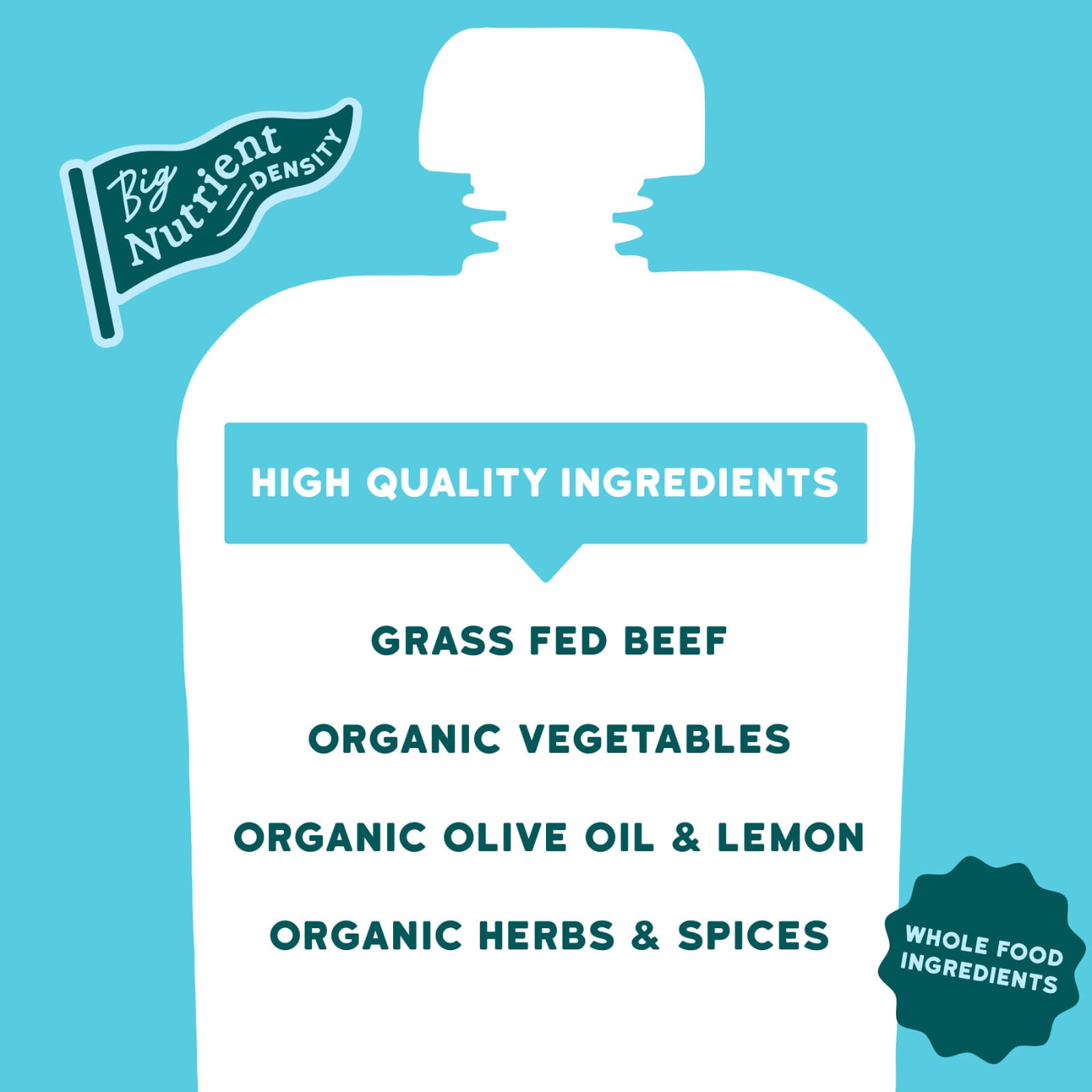 Вода, говядина травяного откорма, органическая морковь, органический пастернак, органический белый картофель, органический шпинат, органический лимонный сок, органическое оливковое масло, органический лук, органический чеснок, органическая петрушка, Гималайская морская соль, органическое орегано, органический чабрец.