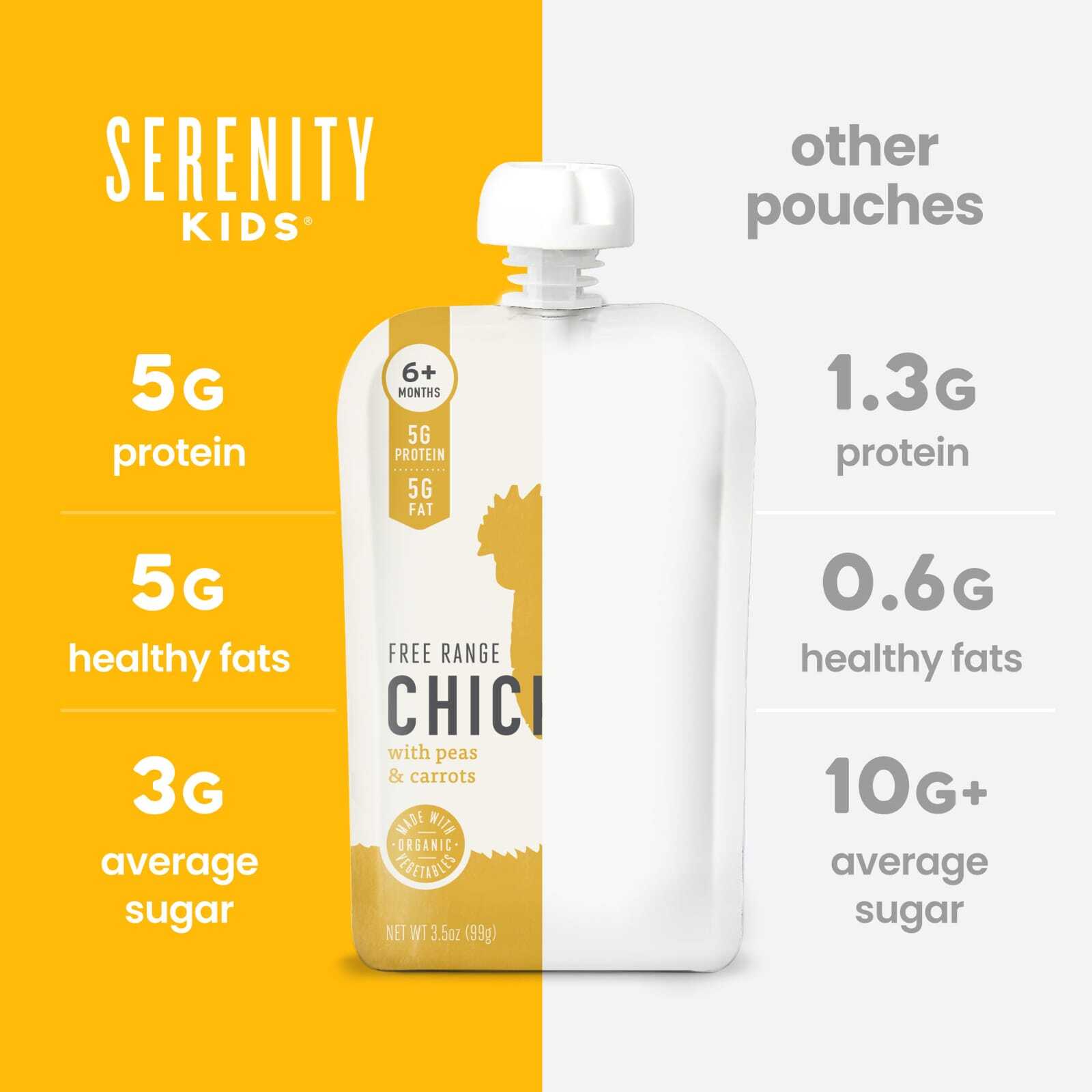 Органический горох, органическая морковь, органическая курица, выращенная в естественных условиях, вода, органическое оливковое масло.