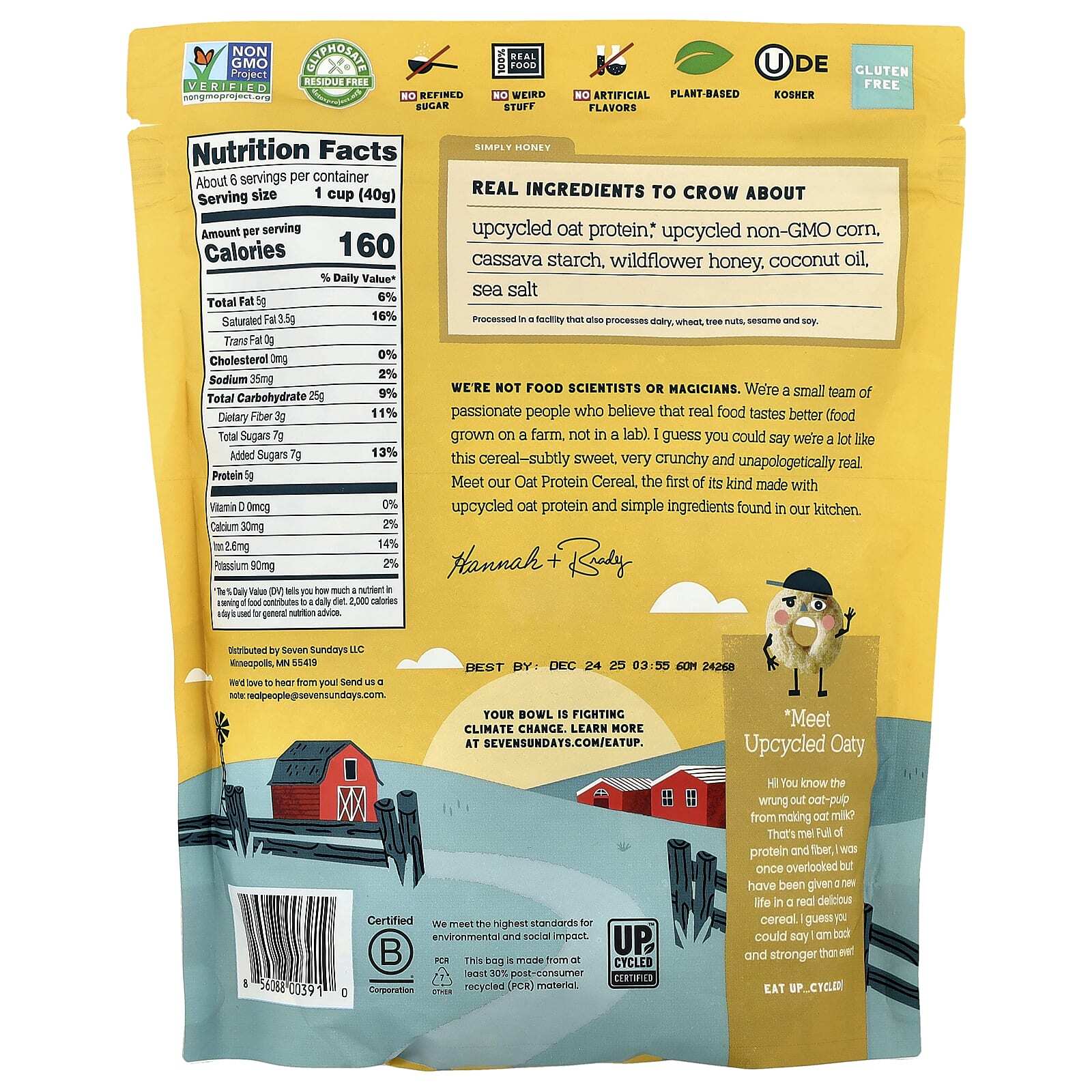 Мы не специалисты в области кулинарии и не фокусники. Мы - небольшая команда увлеченных людей, которые считают, что настоящая еда вкуснее (продукты, выращенные на ферме, а не в лаборатории). Я думаю, можно сказать, что мы очень похожи на эти хлопья - слегка сладкие, очень хрустящие и искренне настоящие. Познакомьтесь с нашими овсяными протеиновыми хлопьями, первыми в своем роде, изготовленными из переработанного овсяного протеина и простых ингредиентов, имеющихся на нашей кухне.