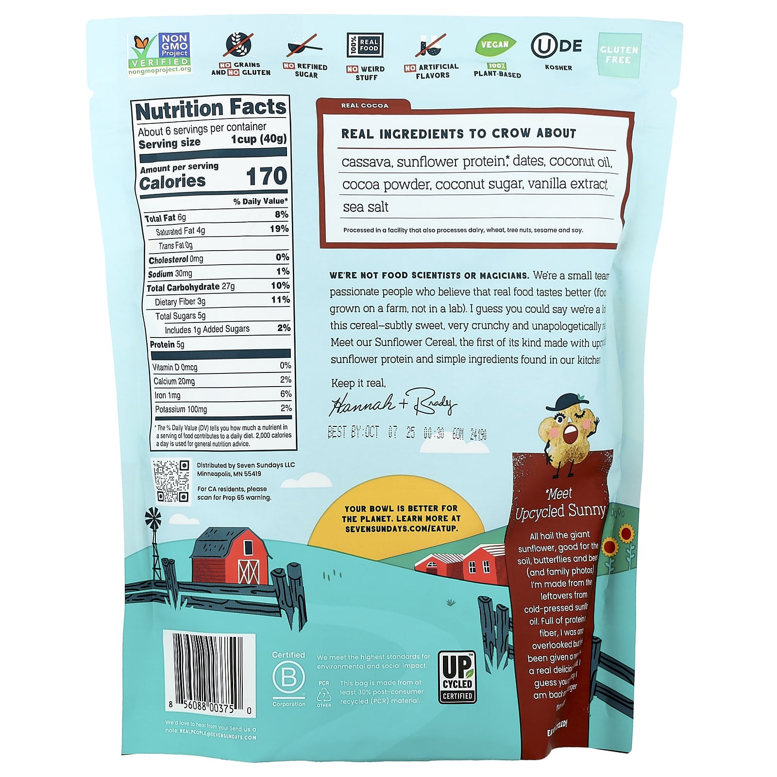 Мы не специалисты в области кулинарии и не фокусники. Мы - небольшая команда увлеченных людей, которые считают, что настоящая еда вкуснее (продукты, выращенные на ферме, а не в лаборатории). Я думаю, можно сказать, что мы очень похожи на эти хлопья - слегка сладкие, очень хрустящие и искренне настоящие. Познакомьтесь с нашими подсолнечными хлопьями, первыми в своем роде, изготовленными из переработанного подсолнечного протеина и простых ингредиентов, имеющихся на нашей кухне.