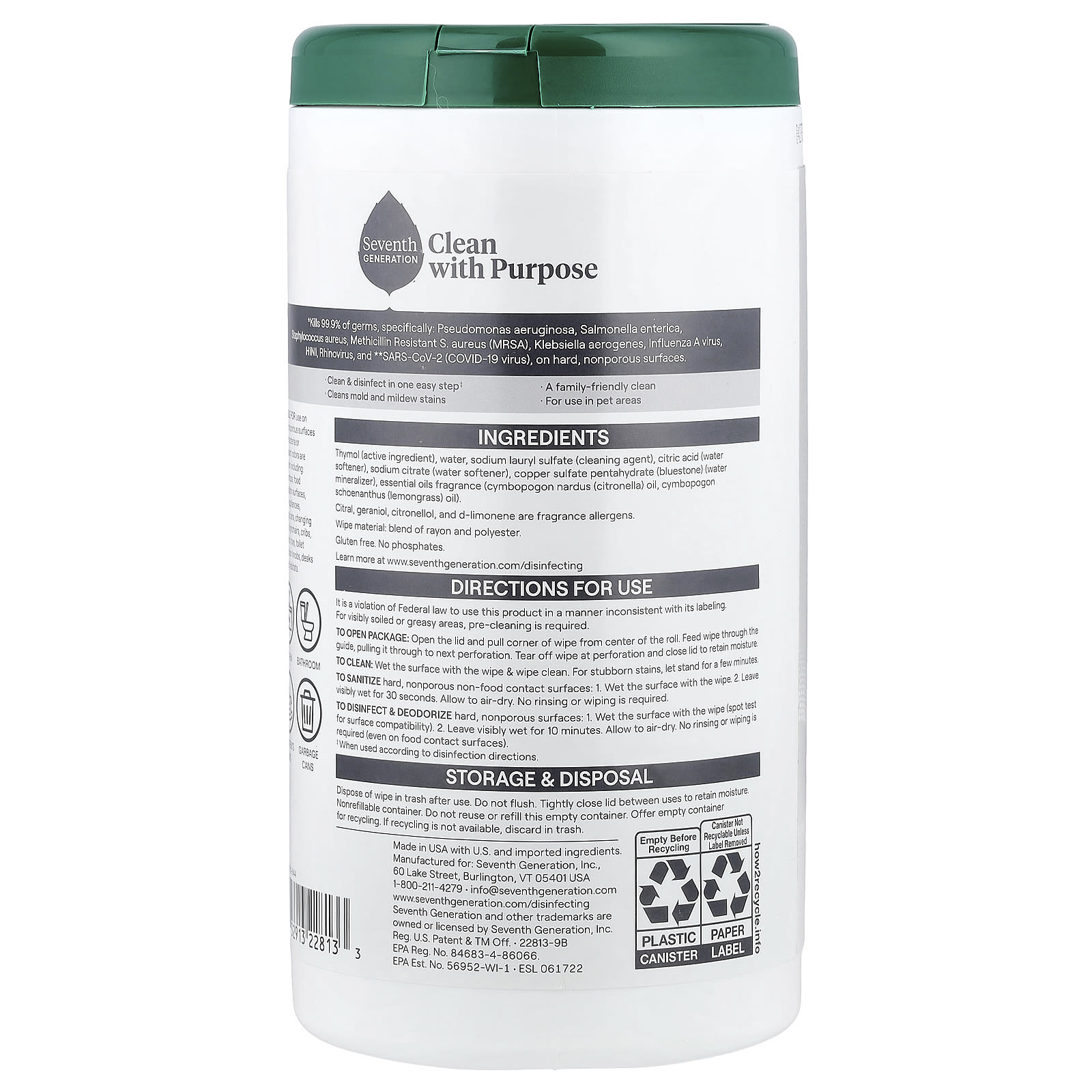 Хранение и утилизация. После использования выбросьте салфетку в корзину. Не смывать в унитаз. Плотно закрывайте крышку между использованием для сохранения влаги. Одноразовый контейнер. Не используйте повторно и не наполняете пустую упаковку повторно. Предоставьте пустую тару для переработки. Если переработка недоступна, выбрасывайте вместе с бытовым мусором.