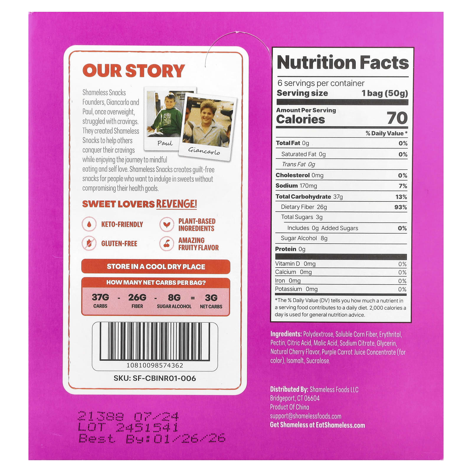 Основатели компании Shameless Snacks, Джанкарло и Пол, когда-то страдали от избыточного веса и боролись с тягой к сладкому. Они создали Shameless Snacks, чтобы помочь другим победить свои пристрастия и найти путь к осознанному питанию и любви к себе. Shameless Snacks — это снеки для людей, которые хотят лакомиться конфетами, не испытывая угрызений совести и не жертвуя своим здоровьем.