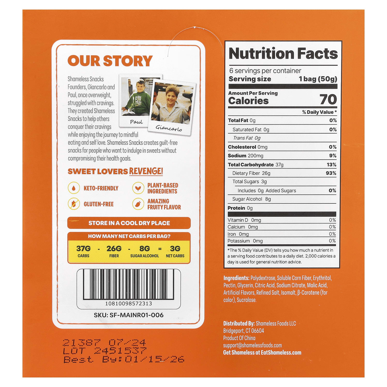 Полидекстроза, растворимая кукурузная клетчатка, эритритол, пектин, глицерин, лимонная кислота, цитрат натрия, яблочная кислота, искусственных ароматизаторов, рафинированная соль, изомальт, ß-каротин (краситель), сукралоза.