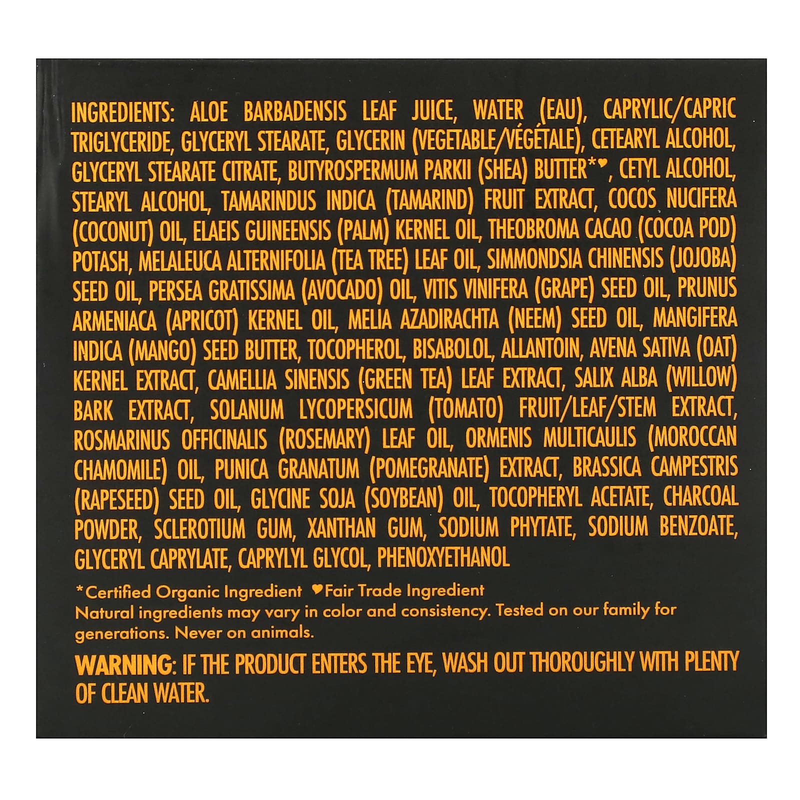 (кокосовое) масло, масло из пальмовых ядер (Elaeis guineensis), зола из стручков какао (Theobroma cacao), масло из листьев чайного дерева (Melaleuca alternifolia), масло из семян жожоба (Simmondsia chinensis), масло авокадо (Persea gratissima), масло из виноградных косточек (Vitis vinifera), масло из косточек абрикоса (Prunus armeniaca), масло из семян нима (Melia azadirachta), масло из косточек манго (Mangifera indica), токоферол, бисаболол, аллантоин, экстракт ядер овса (Avena sativa), экстракт листьев зеленого чая (Camellia sinensis), экстракт коры ивы (Salix alba), экстракт плодов/листьев/стеблей томата (Solanum lycopersicum), масло из листьев розмарина (Rosmarinus officinalis), масло ромашки марокканской (Ormenis multicaulis), экстракт граната (Punica granatum), рапсовое масло (Brassica campestris), соевое масло (Glycine soja), токоферилацетат, порошок из древесного угля, смола склероций, ксантановая камедь, фитат натрия, бензоат натрия, глицерил каприлат, каприлилгликоль, феноксиэтанол.