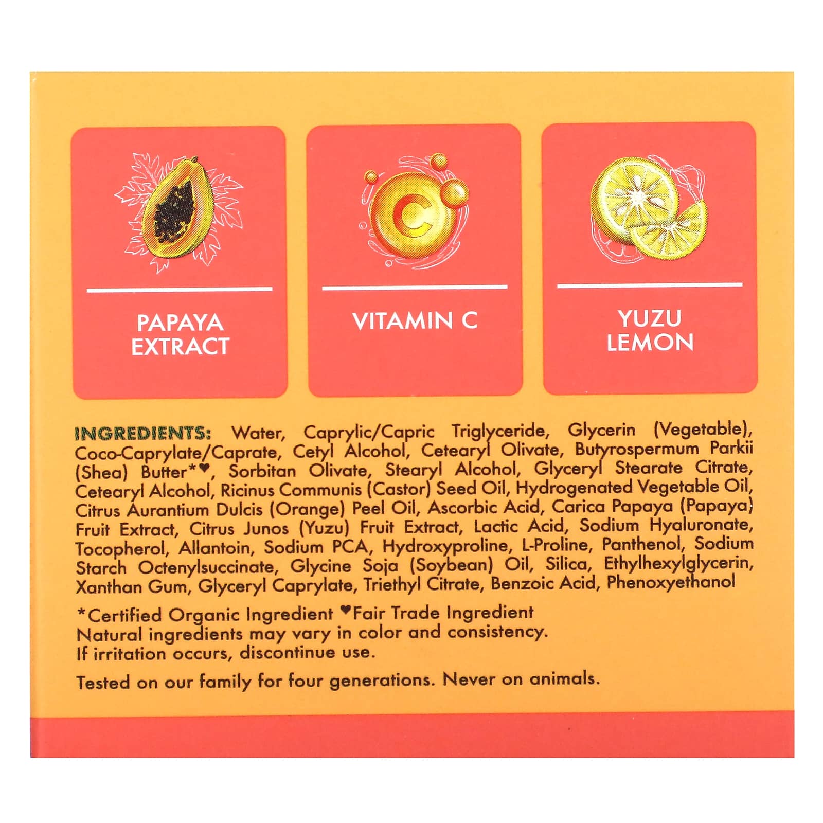 Вода, каприловый/каприновый триглицерид, глицерин (растительный), кококаприлат / капрат, цетиловый спирт, цетеарил оливат, масло ши (Butyrospermum parkii)*^, сорбитан оливат, стеариловый спирт, глицерил стеарат цитрат, цетеариловый спирт, касторовое масло (Ricinus communis), гидрогенизированное растительное масло, масло из цедры апельсина (Citrus aurantium dulcis), аскорбиновая кислота, экстракт плодов папайи (Carica papaya), экстракт плодов юдзу (Citrus junos), молочная кислота, гиалуронат натрия, токоферол, аллантоин, натрия пирролидонкарбонат, гидроксипролин, L-пролин, пантенол, натрия крахмал октенилсукцинат, соевое масло (Glycine soja), диоксид кремния, этилгексилглицерин, ксантановая камедь, глицерил каприлат, триэтилцитрат, бензойной кислоты, феноксиэтанол.