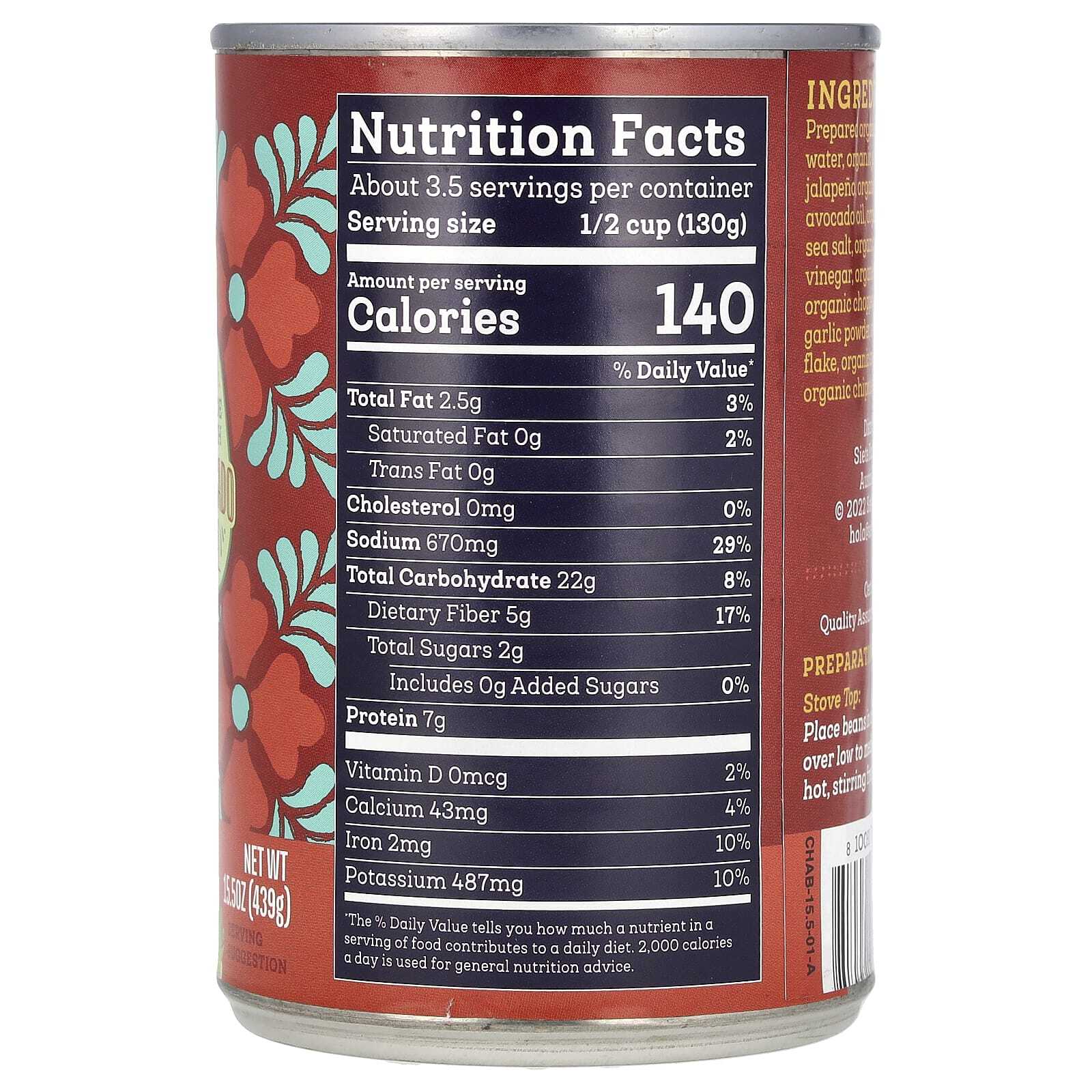 Подготовленная органическая фасоль пинто, вода, органический халапеньо (органический халапеньо, органический уксус, соль), масло авокадо, органическая томатная паста, морская соль, органический яблочный уксус, экстракт органических дрожжей, органический нарезанный лук, органический чесночный порошок, хлопья органических томатов, органическая копченая паприка, органический порошок чипотле.