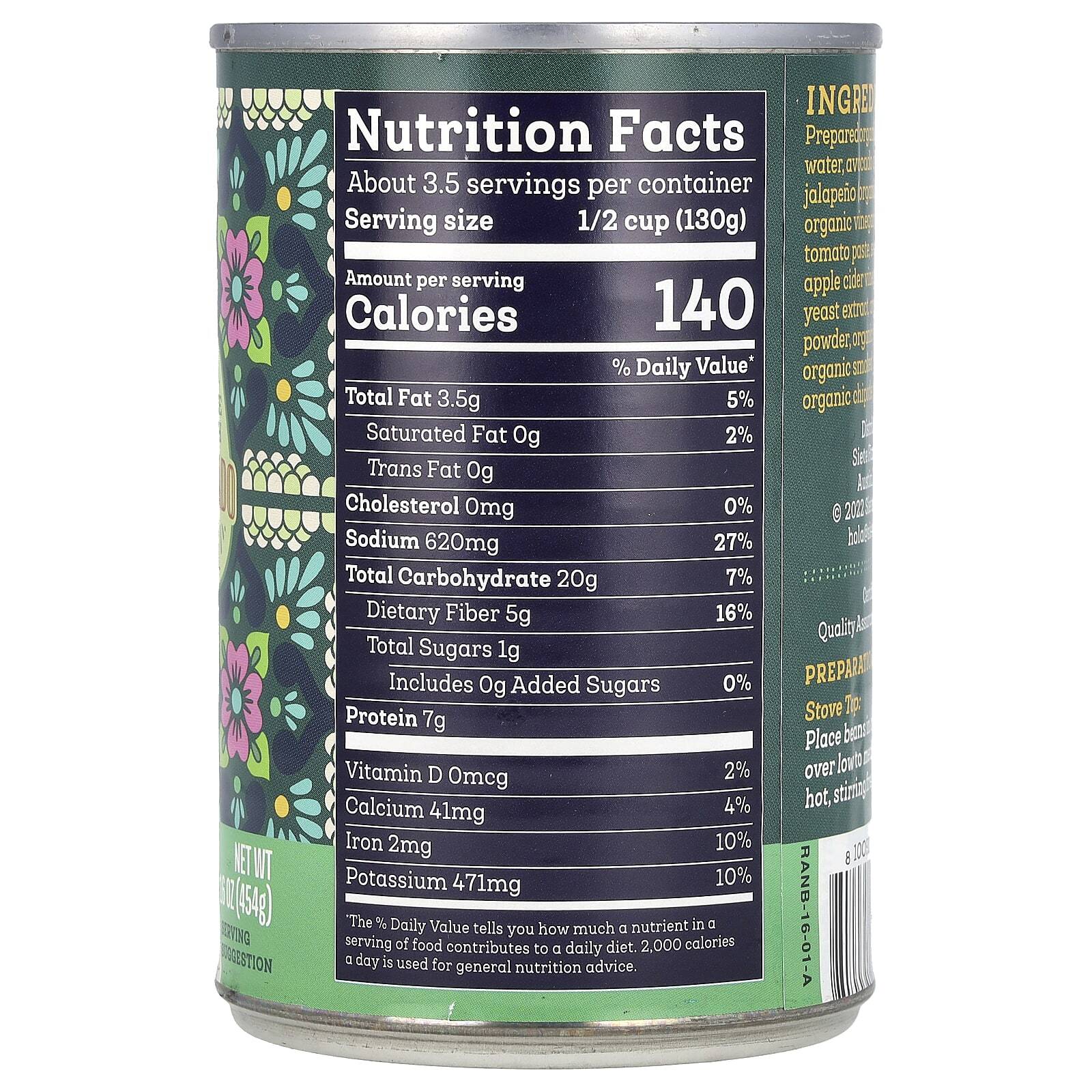 Подготовленная органическая фасоль пинто, вода, масло авокадо, органический халапеньо (органический халапеньо, органический уксус, соль), органическая томатная паста, морская соль, органический яблочный уксус, экстракт органических дрожжей, органический луковый порошок, органический чесночный порошок, органическая копченая паприка, органический порошок чипотле.