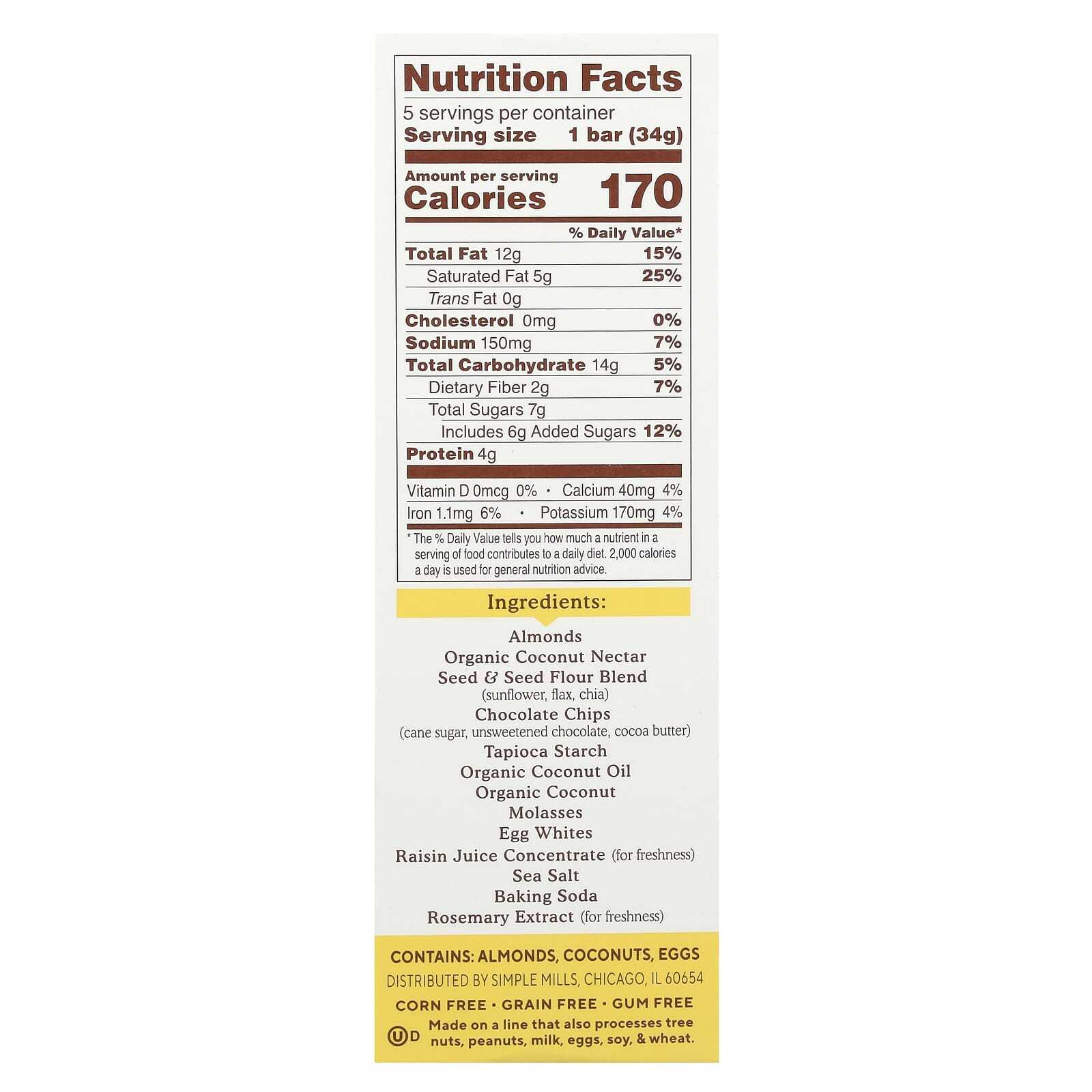 Миндаль, органический кокосовый нектар, смесь муки из семян (подсолнечника, льна, чиа), шоколадная крошка (тростниковый сахар, горький шоколад, какао-масло), тапиоковый крахмал, органическое кокосовое масло, органический кокос, патока, яичный белок, концентрат сока из изюма (для свежести), морская соль, пищевая сода, экстракт розмарина (для свежести).